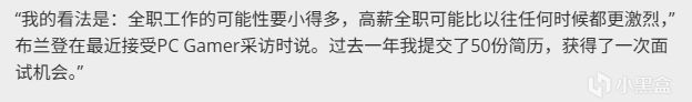 布蘭登指出,目前全職尤其是高薪全職職位競爭比以往任何時候都激烈,許多資深人士(如Bungie前音頻主管)只能依靠合同工作維持生計。他在接受PC Gamer採訪時說:“你得權衡,拿到全職工作後,它能持續多久?”