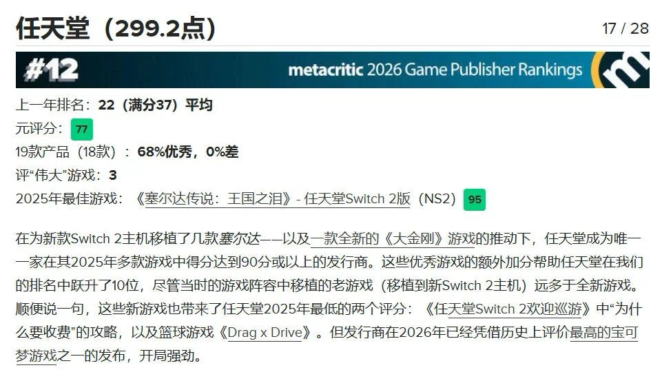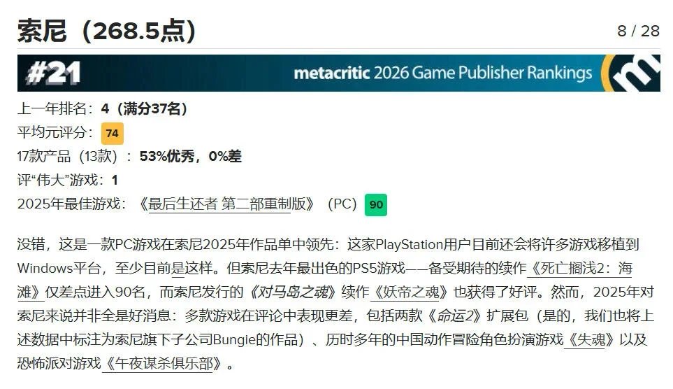 相比之下,任天堂和索尼的排名則顯得有些“委屈”。任天堂今年排名第 17,很大程度上是因爲其 Switch 生命週期末期,大量作品爲舊作移植或小型試水之作,缺乏足以引爆媒體熱情的全新 3A 大作,另一方面,儘管 Switch 2 的移植版《塞爾達傳說》得分很高,但整體陣容的深度和廣度不及往年。索尼則受困於幾部備受期待的大作未能達到預期高度,加上部分多人服務型遊戲的口碑波動,拉低了整體均分。