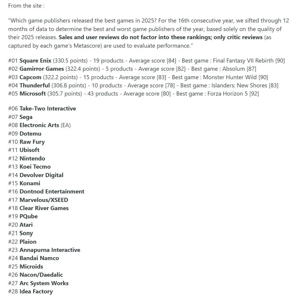 這多少有些令人意外,畢竟在玩家社羣中,這家以《最終幻想》和《勇者鬥惡龍》聞名的公司近年來常因“公式化”和“定價策略”受到調侃。但數據不會撒謊:在 2025 年,SE 發行的每一款遊戲都獲得了媒體的正面評價,實現了罕見的“全綠”成就(即所有產品 Metascore 均在 75 分以上),憑藉極高的平均分和零差評的記錄,他們首次在這項長達 16 年的評選中奪魁。
