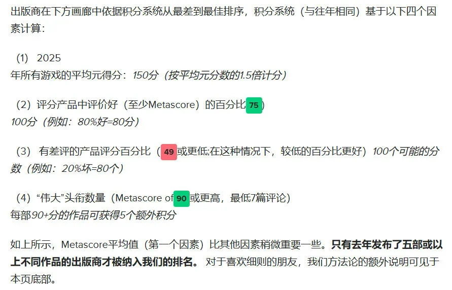 榜單的計算邏輯簡單到有些“固執”:它完全不看銷量,不看營收,甚至不看玩家的用戶評分。它只在乎一件事:專業媒體和評論家給出的分數。在這個純粹由“質量”與“聲量”決定的競技場裏,2025 年的故事走向讓所有人大跌眼鏡:常年霸榜的歐美 3A 大廠紛紛落馬,而一家來自中國的獨立遊戲發行商,竟然悄然爬上了全球第二的高位。