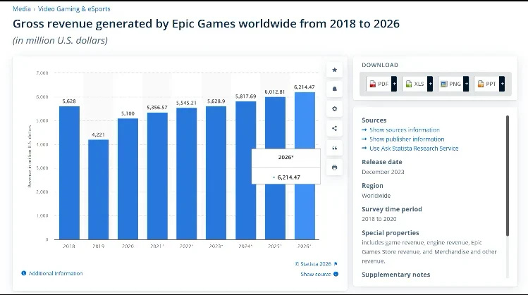 很多人无法理解,《堡垒之夜》这么一台印钞机怎么会入不敷出?Statista的数据明明白白写着,Epic 2025年预估收入超过60亿美元,同比仍在增长。大盘没崩。真正击穿利润的,是失控的研发杠杆。