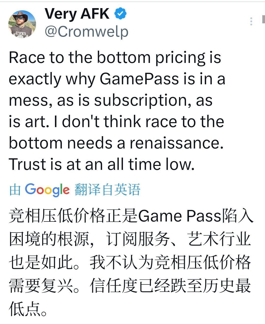 《博德之门3》发行总监Michael Douse在网上直接回应了这则新闻,引发行业热议。“价格战,竞相降价正是Game Pass陷入混乱、订阅模式陷入混乱、艺术创作陷入混乱的原因。我不认为价格战需要‘文艺复兴’。信任已经降到历史最低点。”