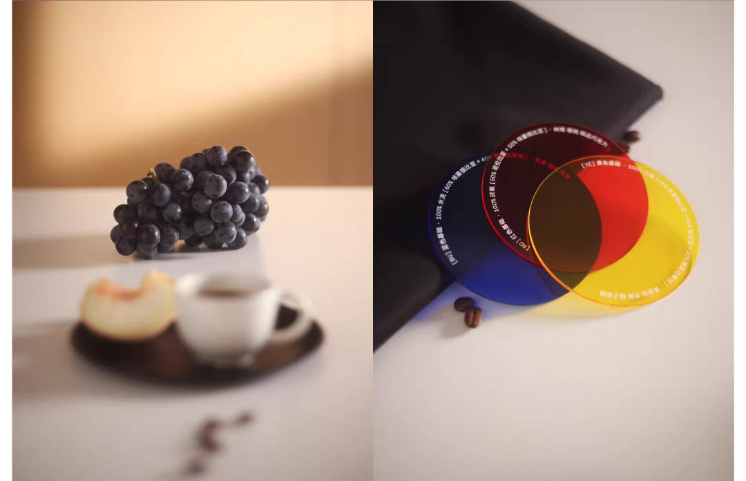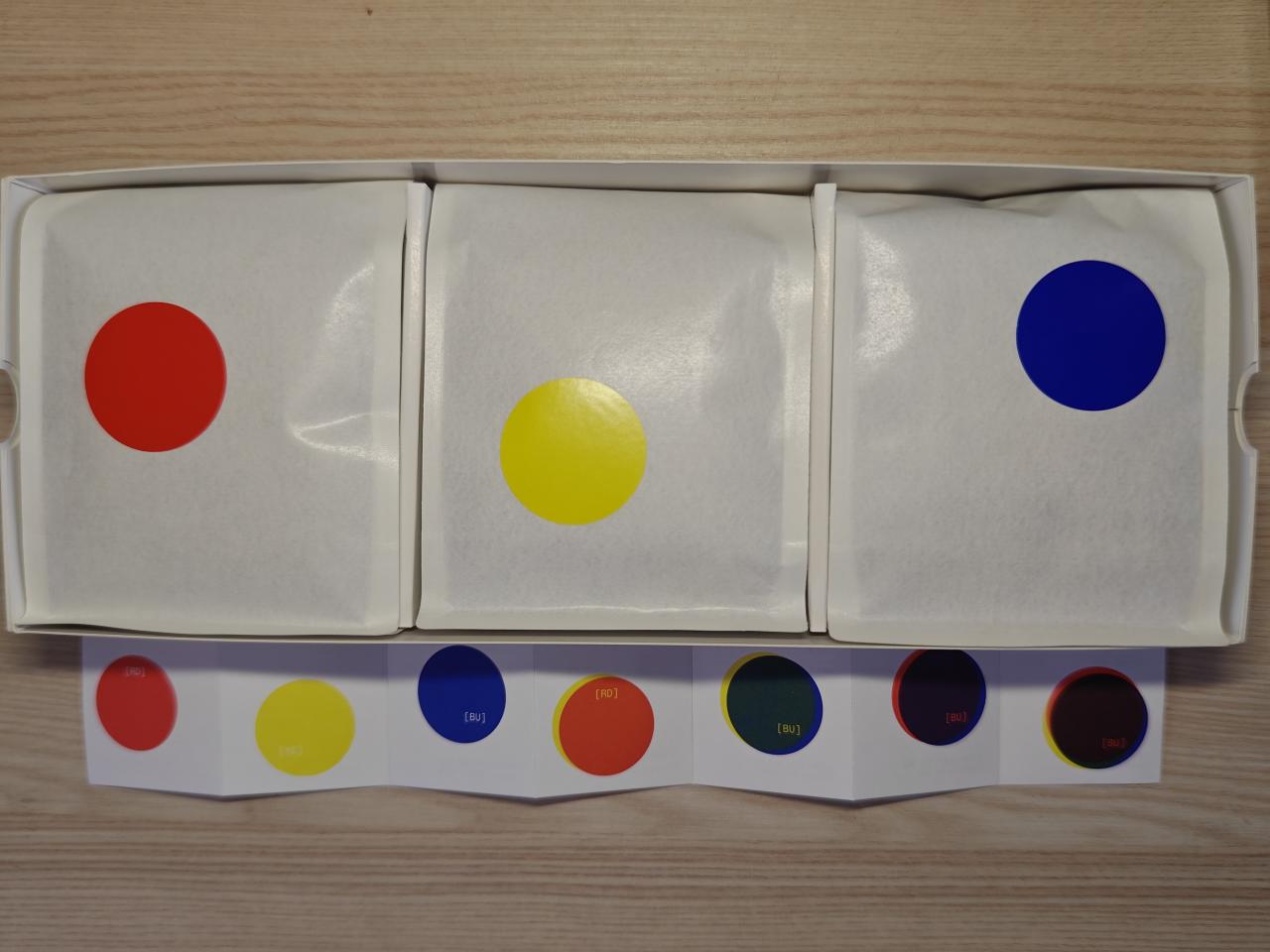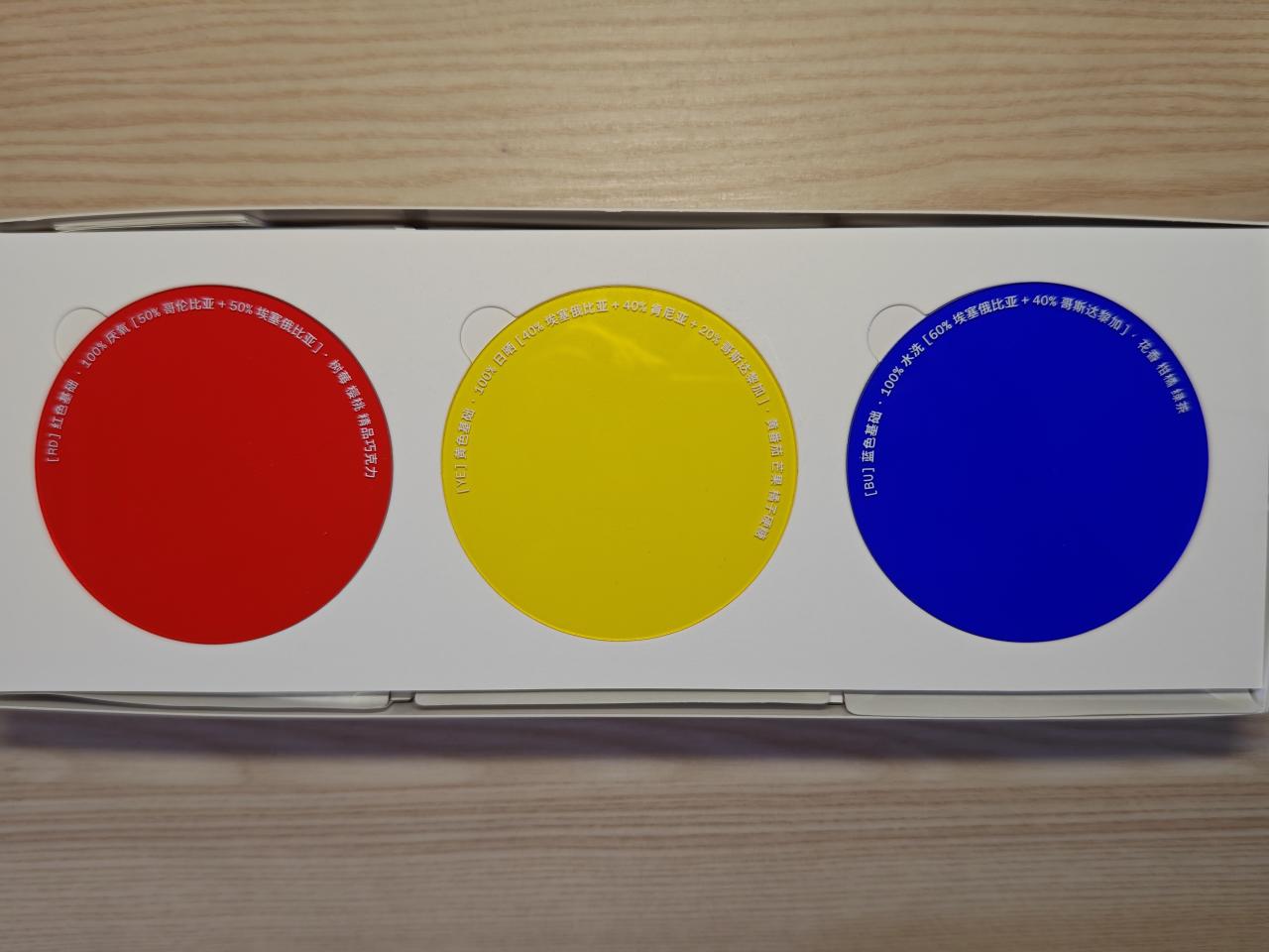 打開外包裝,映入眼簾的就是三塊亞克力板,這也是這套豆子的主題——三原色。再往下翻便能看到一張小小的說明書,上面寫好了七種顏色,分別對應着不同的風味描述,其中四個顏色並不能直接得到,需要自己“拼配”,這也是這套豆子的有趣之處——自主拼配。三塊顏色不同的亞克力板,經過不同方式的疊放,陽光下得到不同的顏色,這就是“光的拼配”。