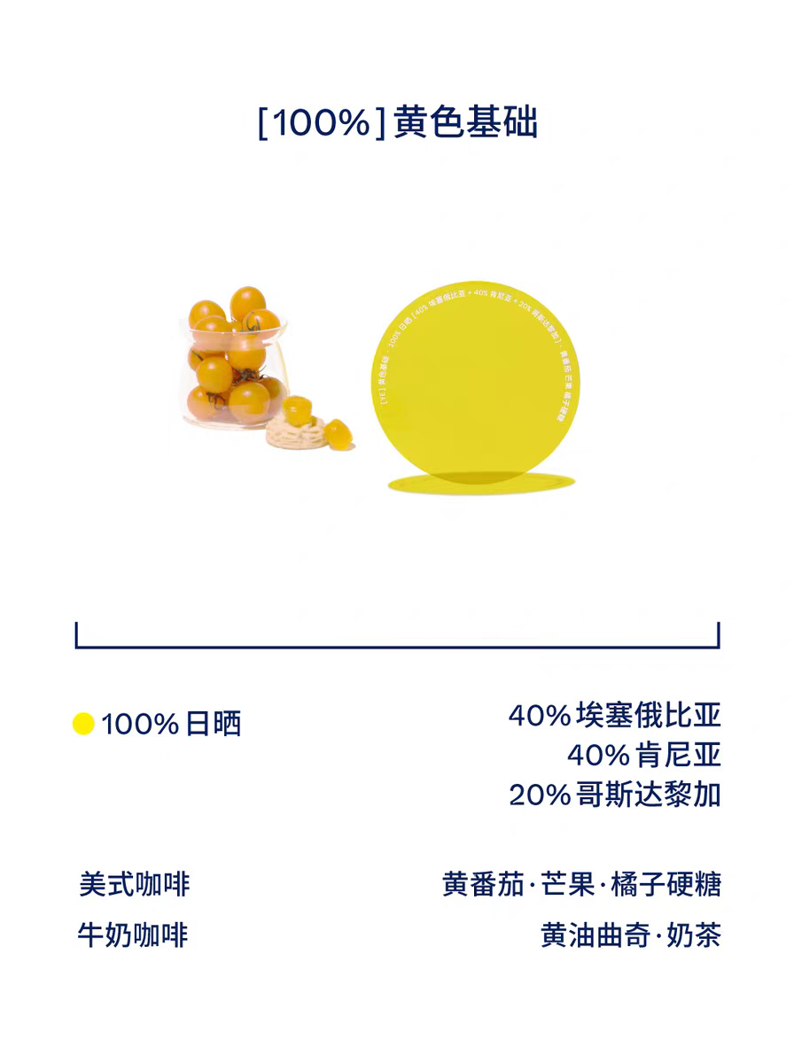 黃色是一包日曬的豆子,因爲肯尼亞與哥斯達黎加的存在,讓這包豆子的甜度更加粘稠,單獨喝奶咖可能感覺存在感不強,甚至稍顯寡淡,但美式方面會有很多汁的水果甜感,而最亮眼的地方並不在單品,先按下不表,之後我們慢慢說。