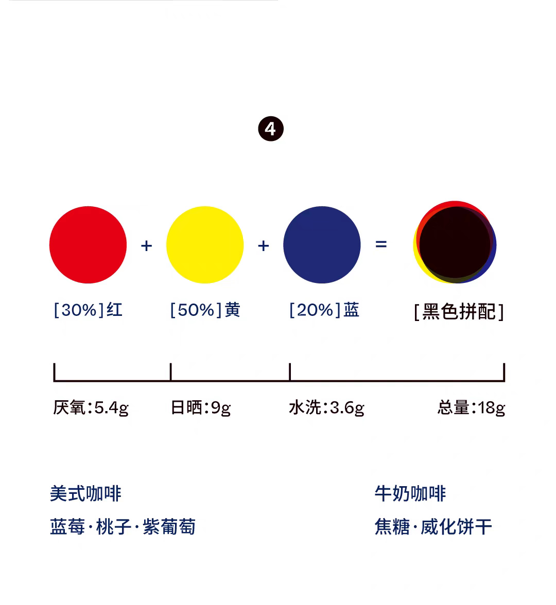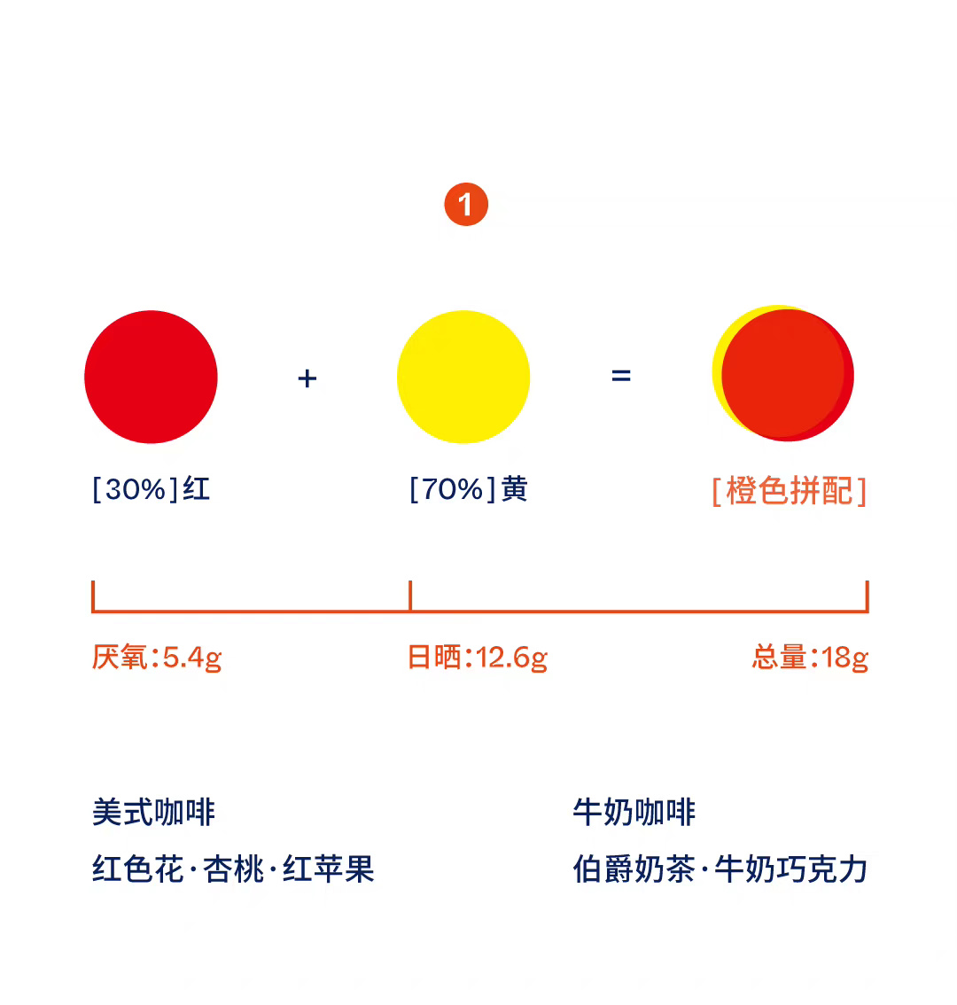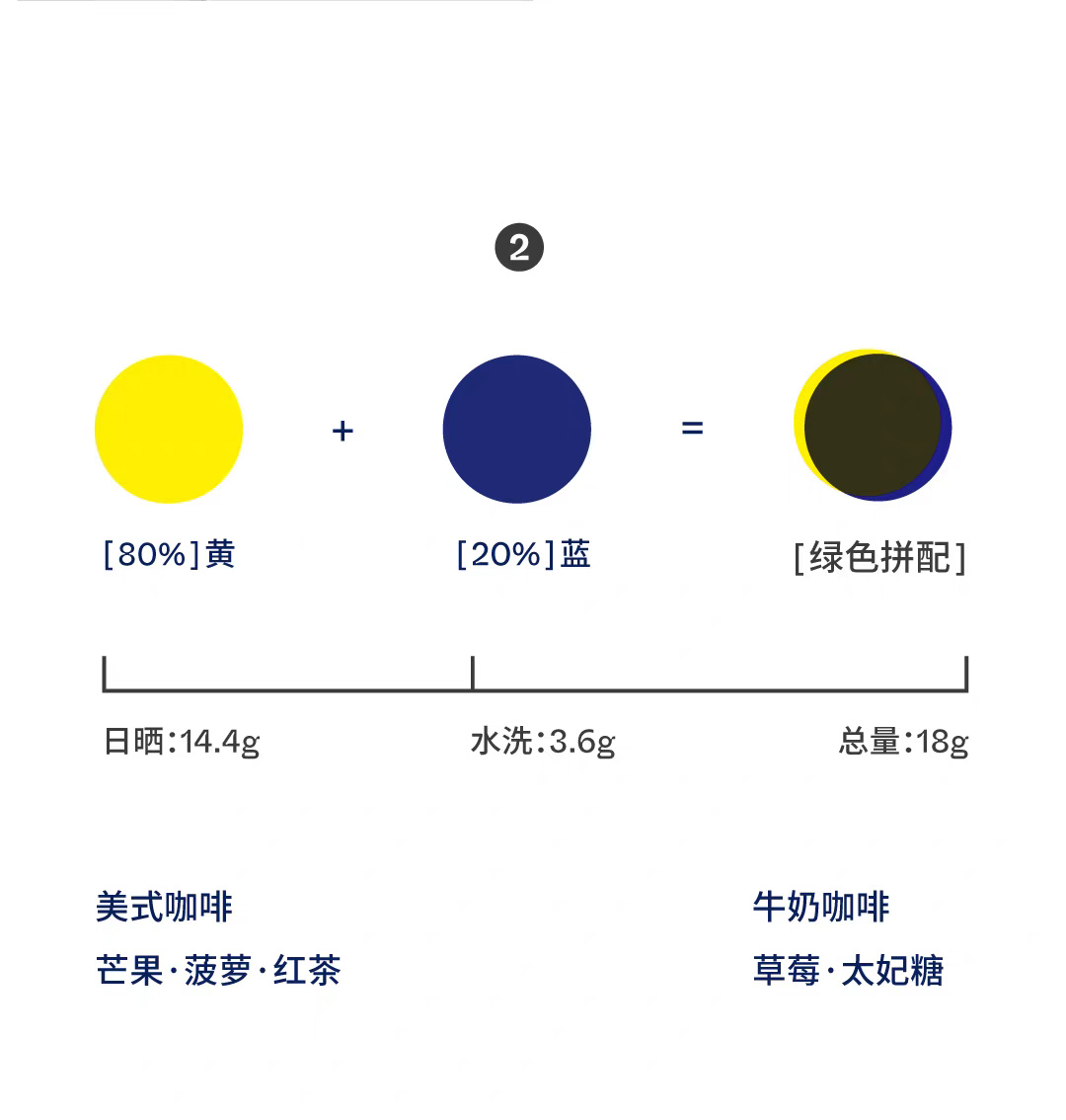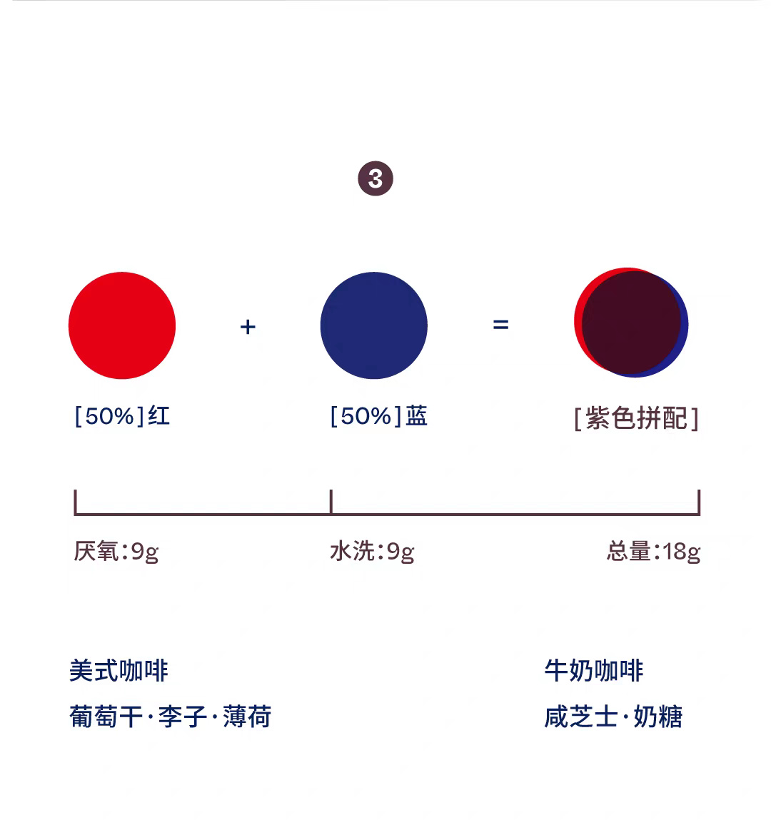 因爲整體拼配風格發酵度較高,也就決定了這個拼配的甜度與醇厚度會較其他拼配更加突出。更多的日曬稀釋了厭氧發酵的發酵感。奶咖喝起來會有一些紅茶做的奶茶的感覺,如果你喜歡甜一些且沒有水果味的奶咖,可以嘗試在這個配方基礎上摸索。