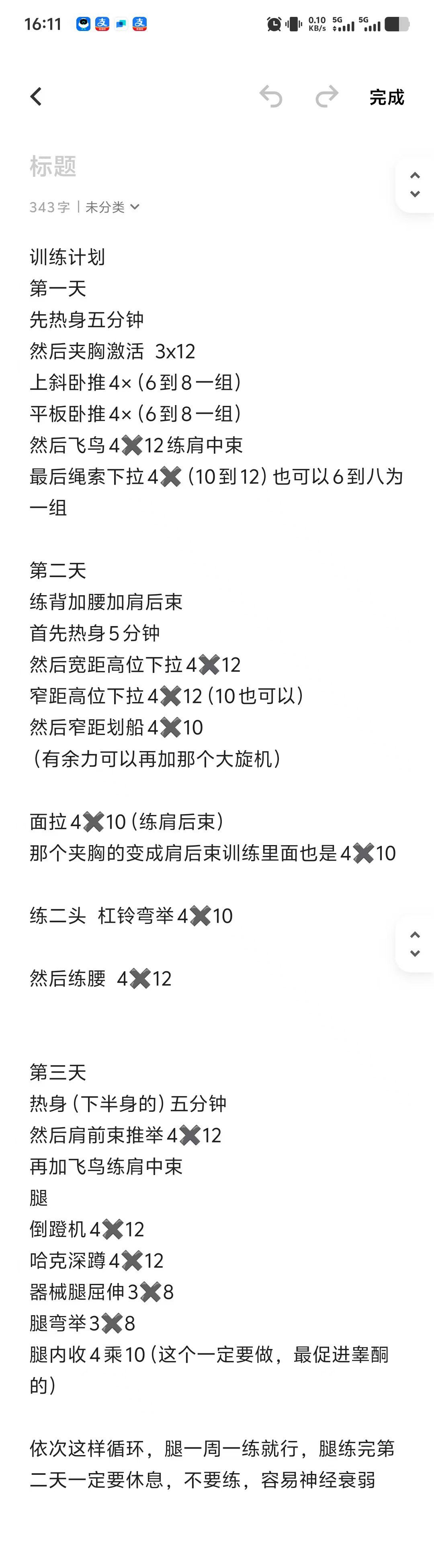 第二點:一定要有訓練計劃,並且堅持,我不推薦一週六練,我剛進健身房就是一週六練,一開始還好,結果後面發現失眠厲害,然後就改成一週五練了(一週兩次腿變成一週一次腿),腿部一定要練,促進肌肉增長)
