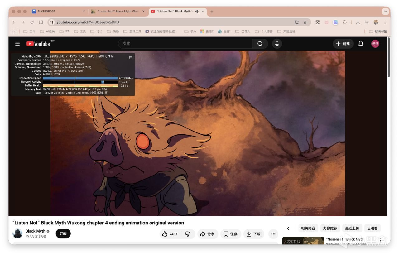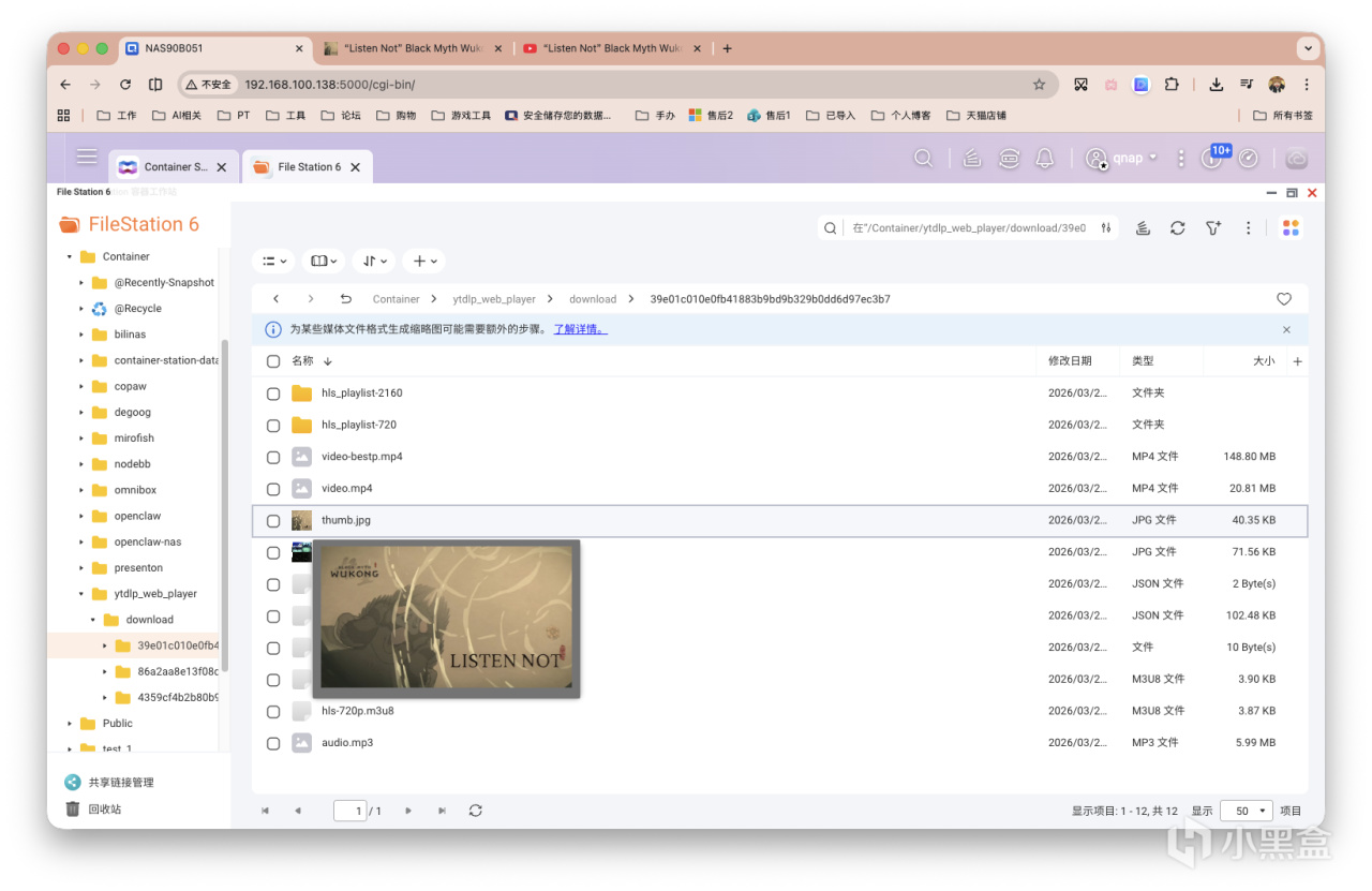 不过需要注意的是,在网页上点击缓存视频会下载到你的本地设备的同时缓存到NAS。其实当你上面点开播放的瞬间,这个视频相关的相关信息便已经down到你的NAS中了。