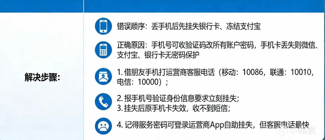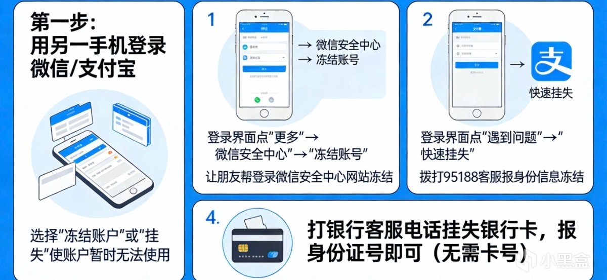 最紧急的是挂失手机卡。因为有了你的手机号,就能收验证码,就能改你所有账户的密码。手机卡在别人手里,你的微信、支付宝、银行卡等于裸奔。