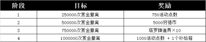 這是一場全社區共同參與的活動,四個階段需要全體獵人合力完成,每一次成功撤離都將計入進度。攜帶賞金令牌成功撤離即可推進進度。全社區撤離次數越多,階段進度填充越快;每一階段完成後,全體玩家均可解鎖對應獎勵。階段目標與獎勵如下: