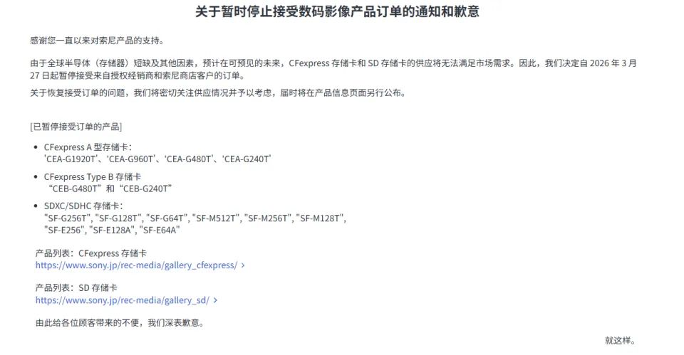 受影响的存储产品包括CFexpress Type-A、Type-B以及SDXC/SDHC系列,仅少数CFexpress Type-B型号和低端SF-UZ系列SD卡仍在生产。索尼表示,此举源于全球存储芯片持续短缺,同时中东冲突引发的氦气供应问题也加剧了制造压力,导致产能无法满足市场需求。目前现有库存售罄前,消费者仍可能在货架上买到部分产品。