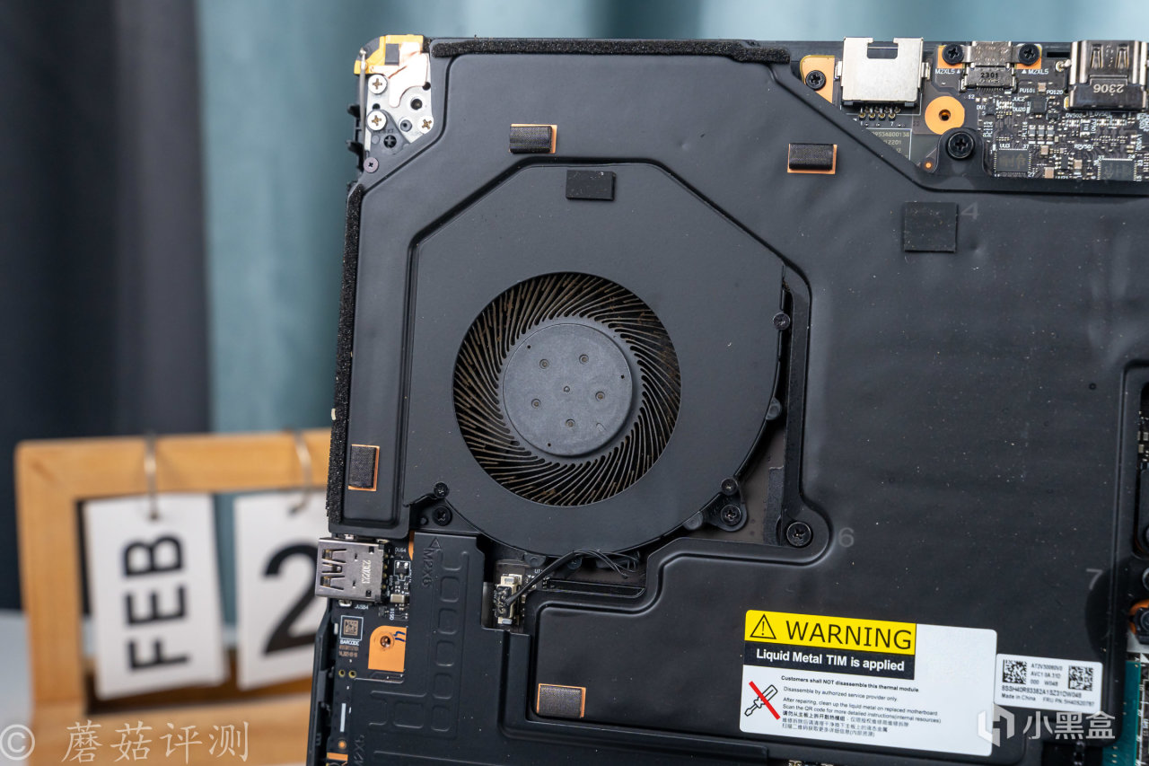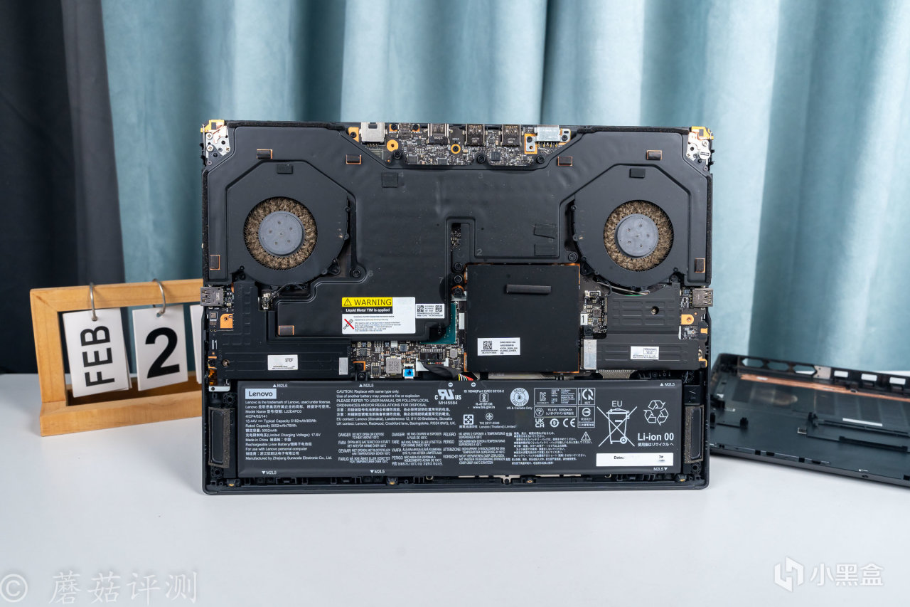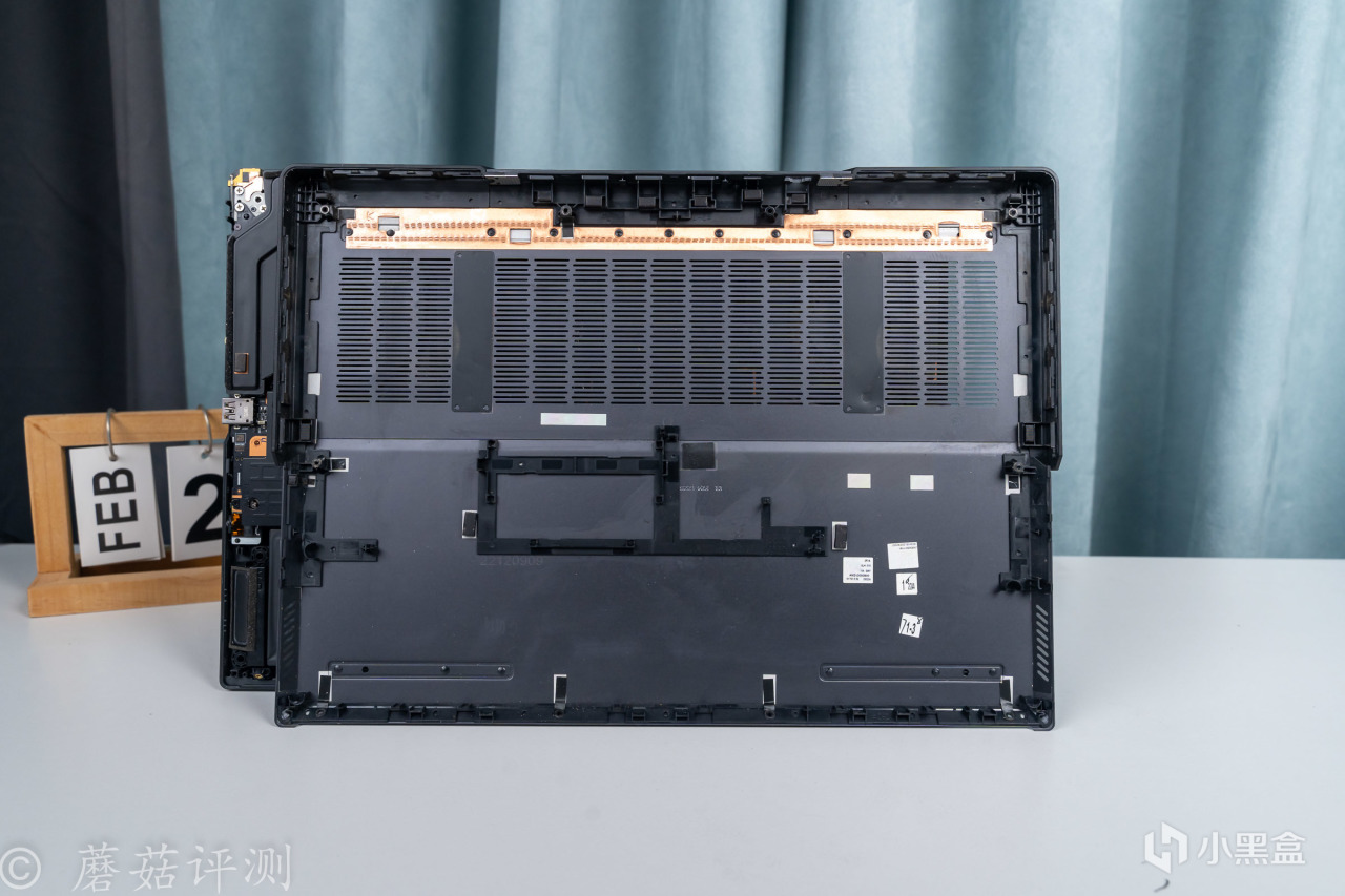 ▼擰掉螺絲,打開D面,筆記本內部的結構還是非常清晰的,上面是一大塊的均熱板,兩側是散熱風扇,底部一整塊都是電池。