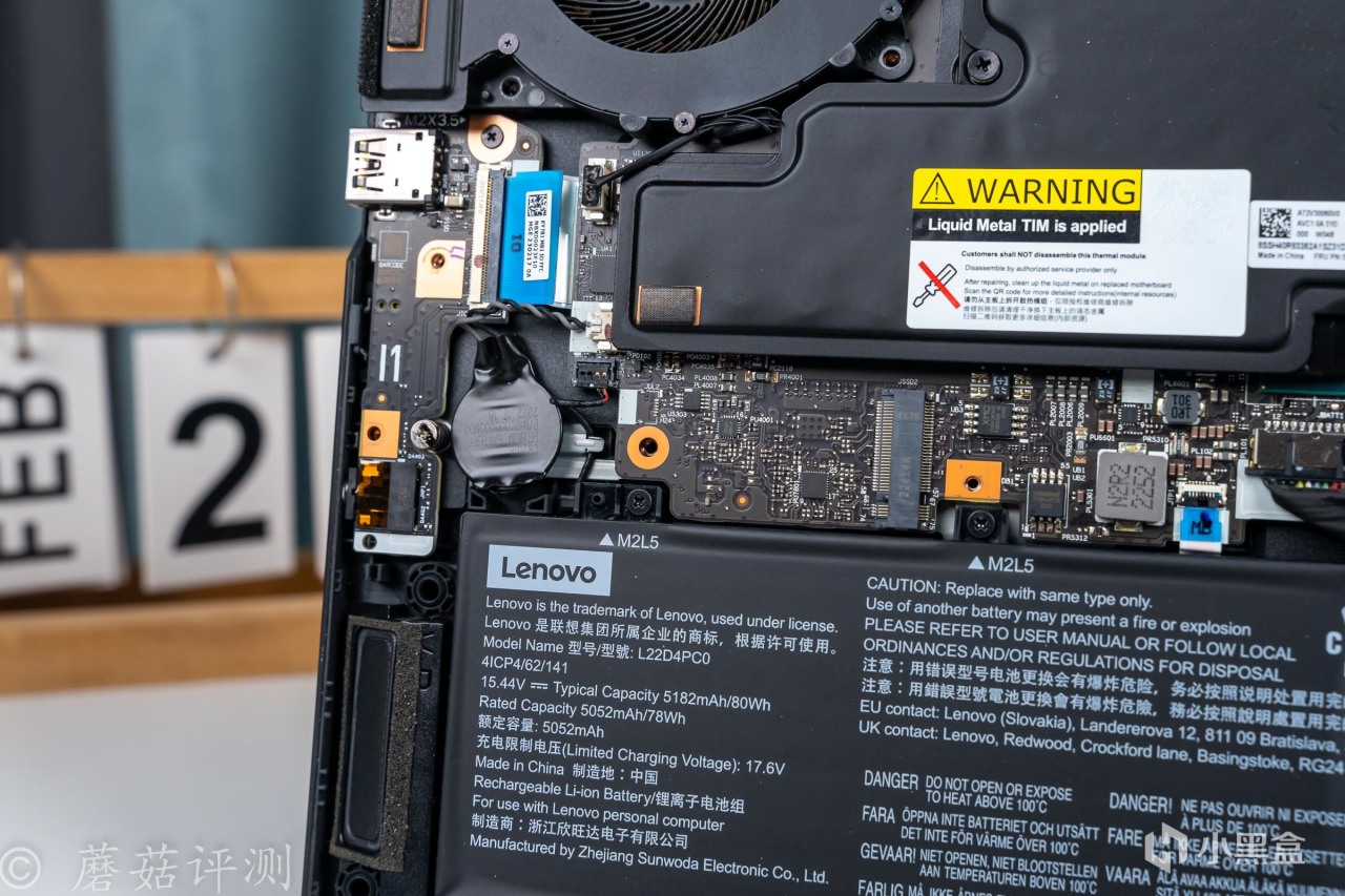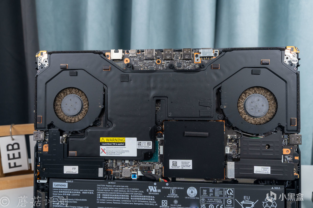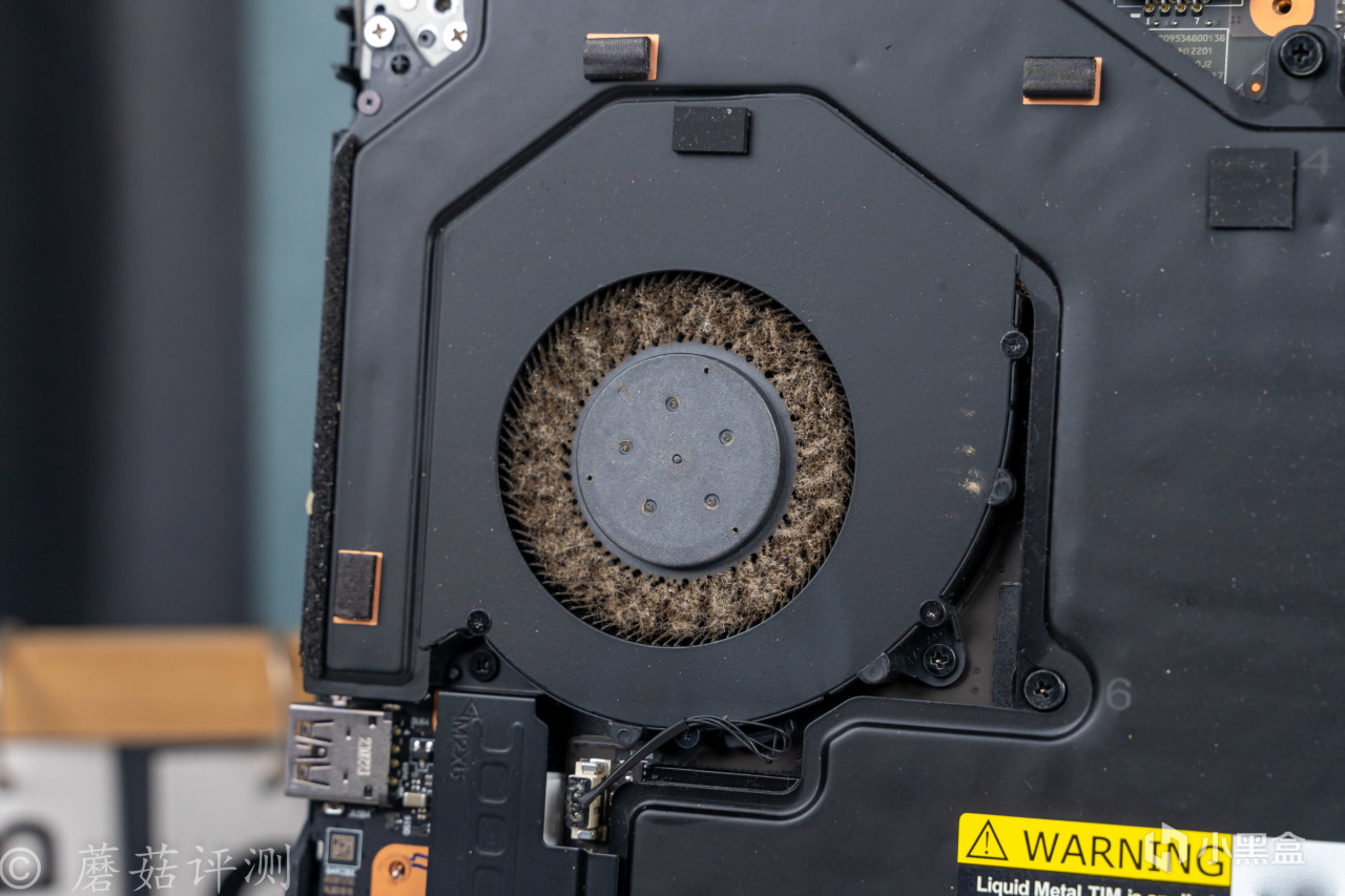 ▼擰掉螺絲,打開D面,筆記本內部的結構還是非常清晰的,上面是一大塊的均熱板,兩側是散熱風扇,底部一整塊都是電池。