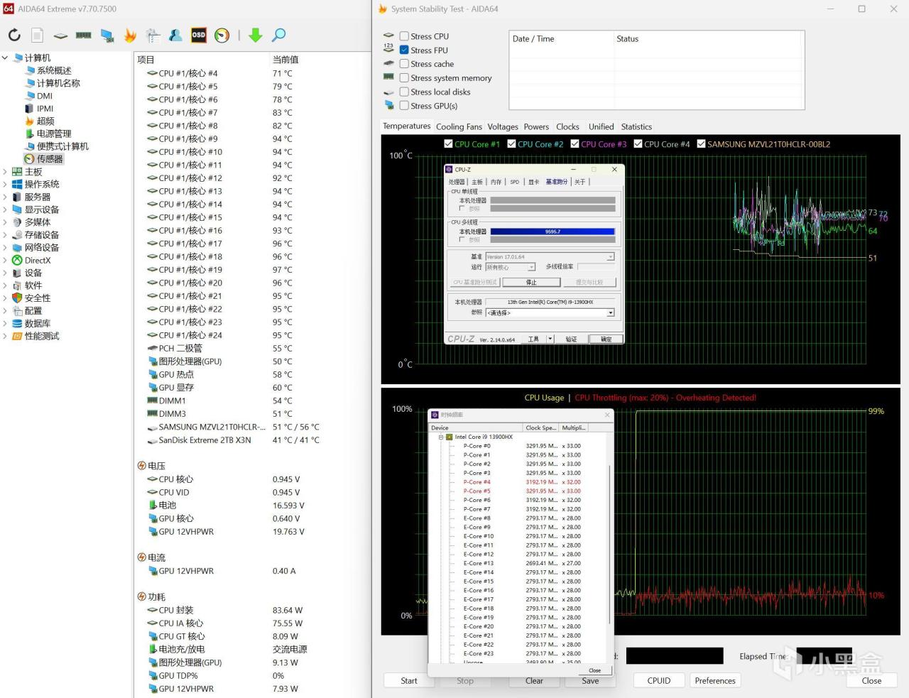 ▼跑CPU-Z的壓力測試的時候,多核得分在9600左右波動,比普通測試低了600分左右,整體表現不錯。