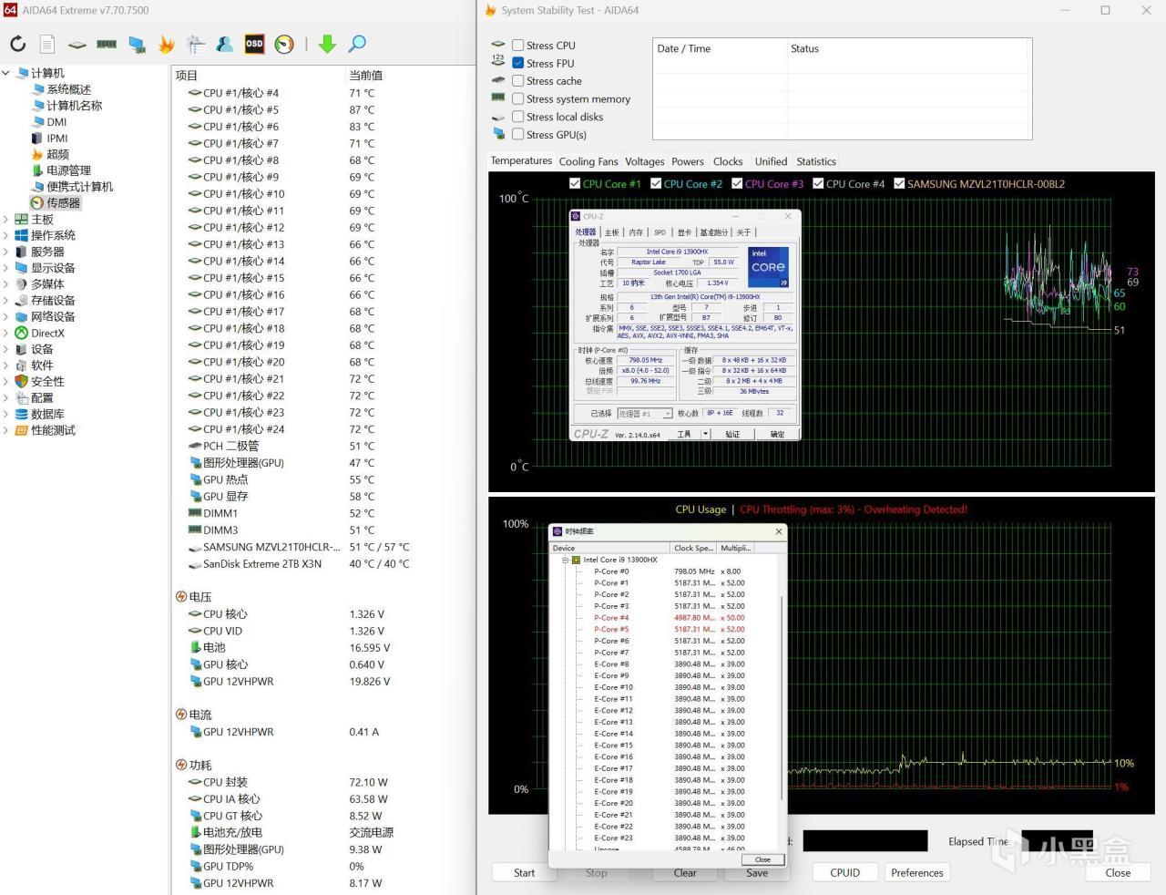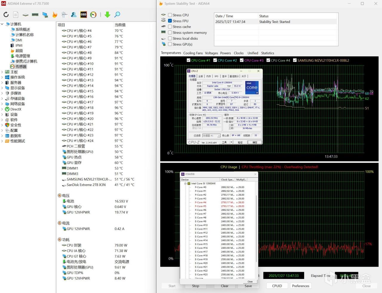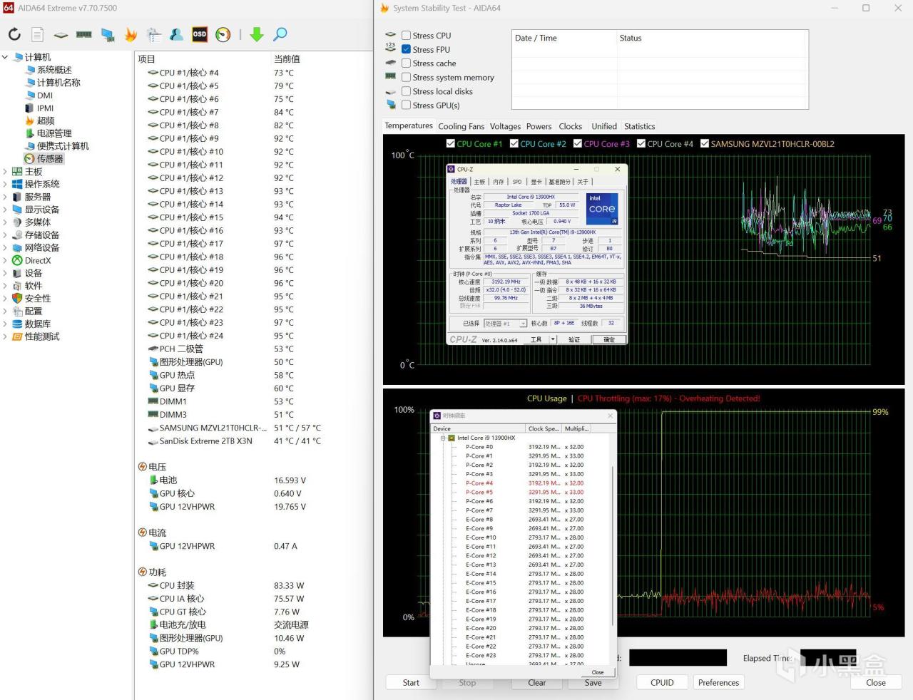 ▼單烤FPU測試,處理器功耗在80W左右,P核睿頻3GHz左右,溫度77℃左右,E核睿頻在2.5GHz左右,溫度97℃。