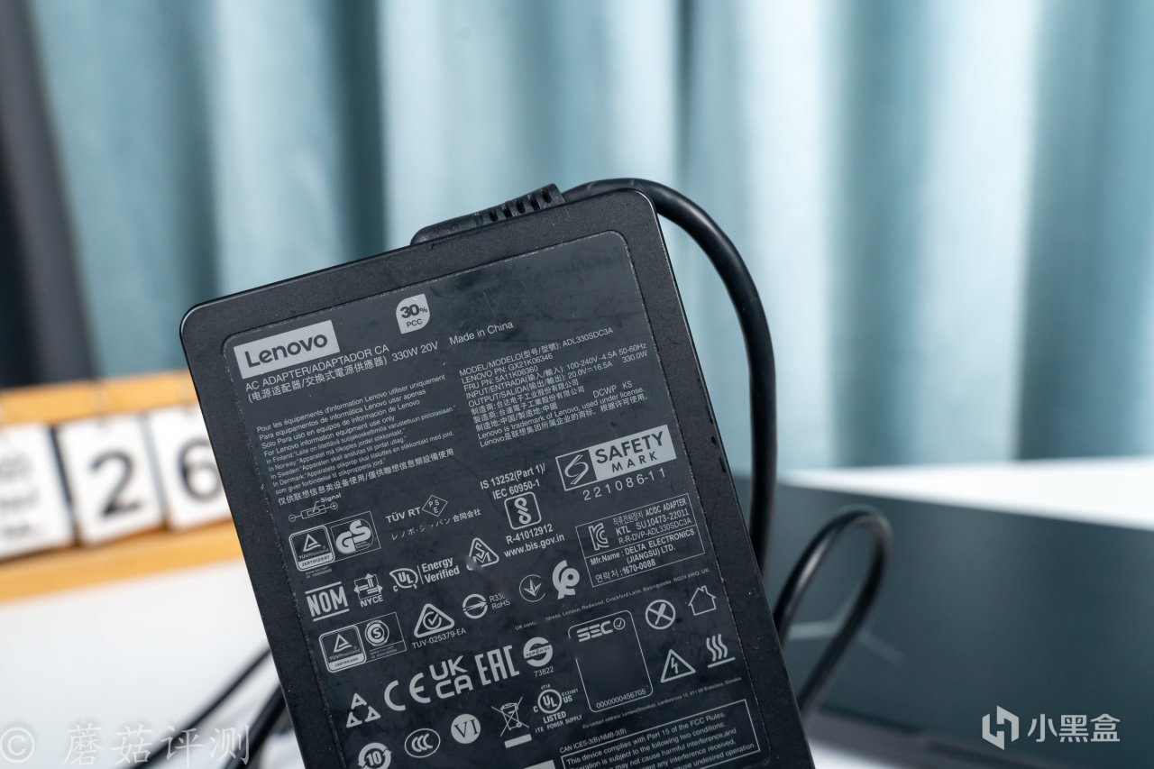 ▼電源適配器的額定功率330W,技術進步很明顯,聽說是氮化鎵技術加持。蘑菇那個時候330W的筆記本電源跟板磚一樣大,現在的輕薄了一大半,蘑菇自己的230W的筆記本電源適配器都比這個大。