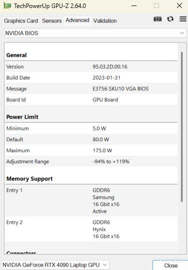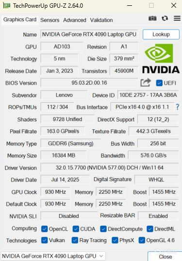 ▼簡單看下RTX 4090 Laptop顯卡的硬件參數,流處理器9728個,顯存16GB,三星的GDDR6顆粒,位寬256bit,硬件參數很不錯。