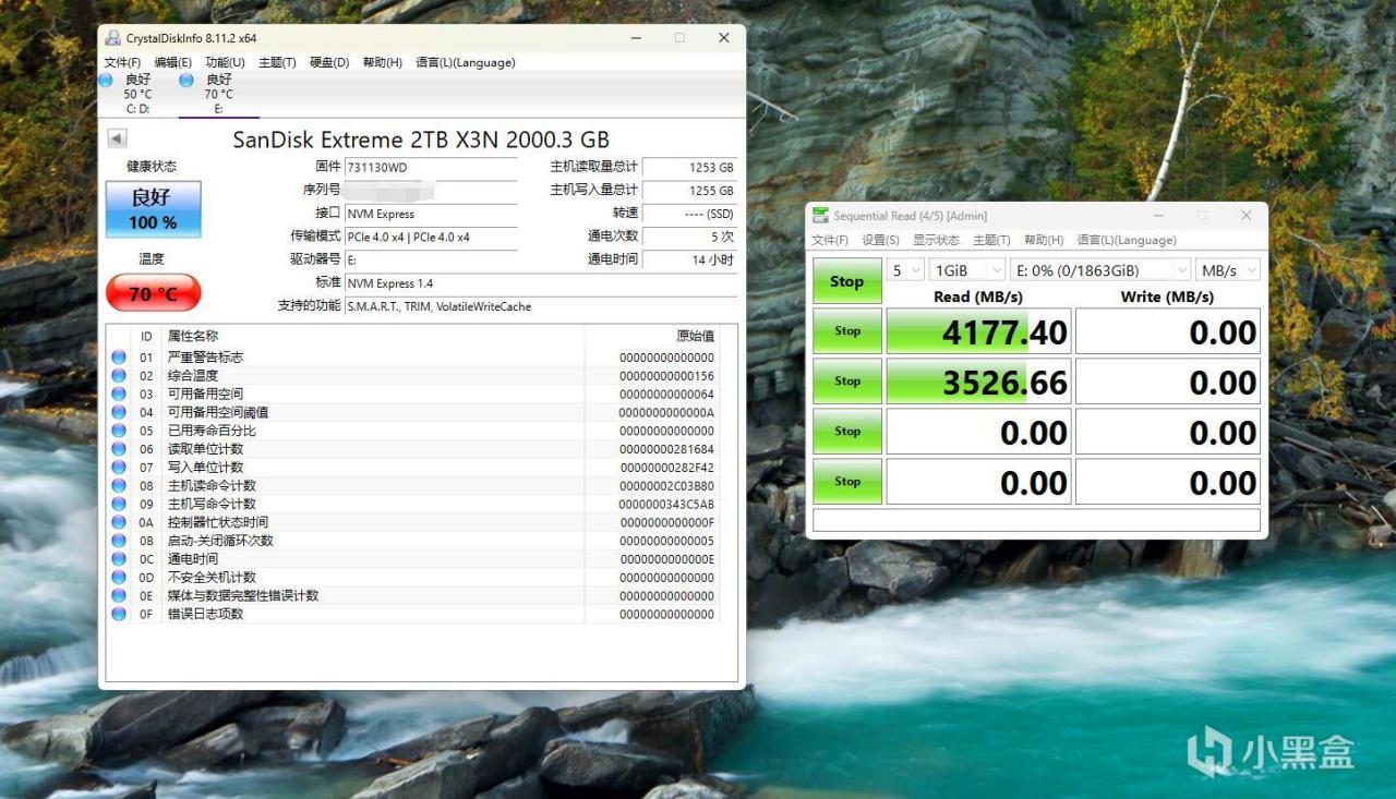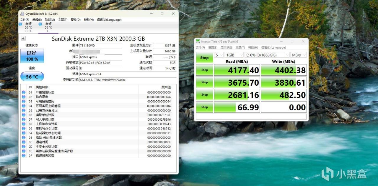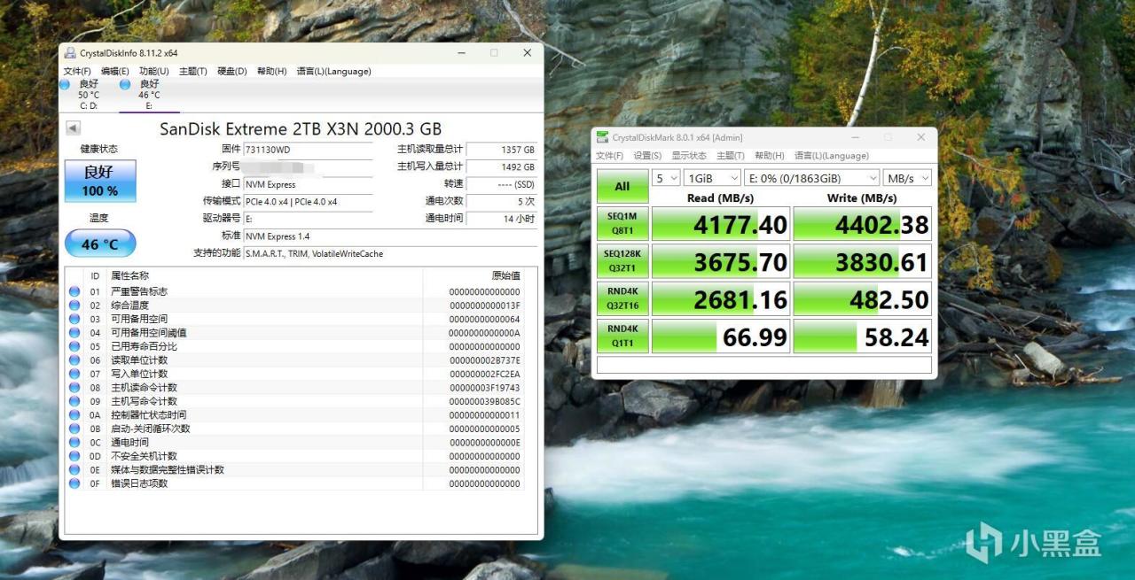 ▼剛跑完測試,固態硬盤溫度就回落到46℃左右。DiskMark測試方面,順序讀取速度4177MB/s、寫入速度4402MB/s,4K讀取66MB/s、寫入在58MB/s左右。
