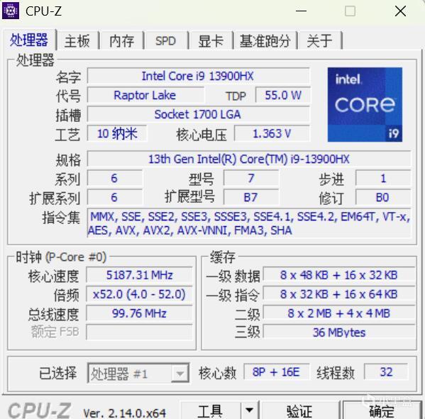 ▼簡單看下CPU的硬件參數,這顆13900HX擁有8個P核、16個E核,三級緩存36MB,這個硬件規格相當豪華,但TDP只有55W,不過這是移動端平臺,可以理解。
