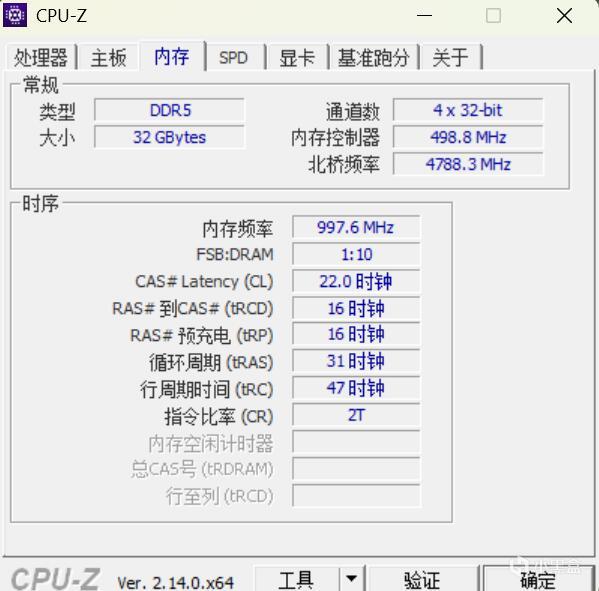 ▼內存是16GB*2,頻率5600MHz,時序46-45-45-89,不知道什麼原因,CPU-Z這裏識別錯了內存的頻率、時序。