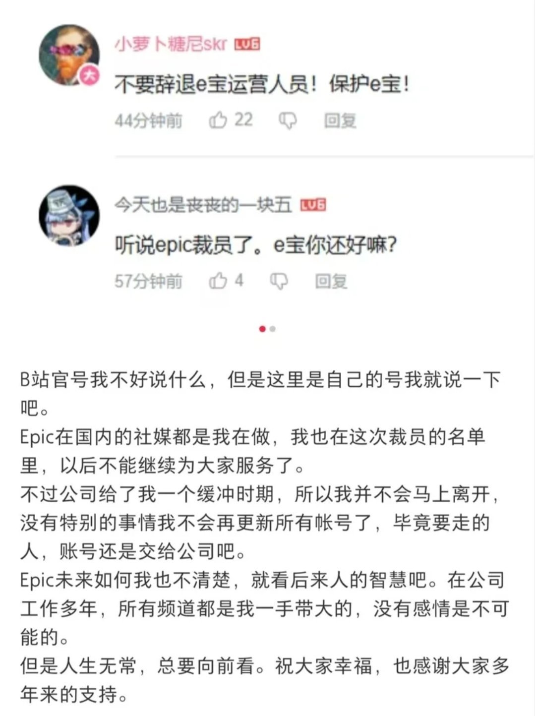 Epic在國內的社媒都是我在做,我也在這次裁員的名單裏,以後不能繼續爲大家服務了。不過公司給了我一個緩衝時期,所以我並不會馬上離開,沒有特別的事情我不會再更新所有帳號了,畢竟要走的人,賬號還是交給公司吧。