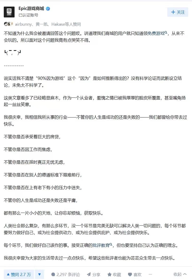 最經典、最出圈的,還是當年關於“網絡遊戲有沒有害”的問題,epic國區運營作出回覆,大家可以看一下~