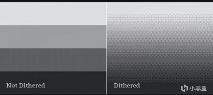抖动(dither)即是利用某种模式,来让色带边界重新排布像素。减少量化误差在低颜色位深图像的影响。