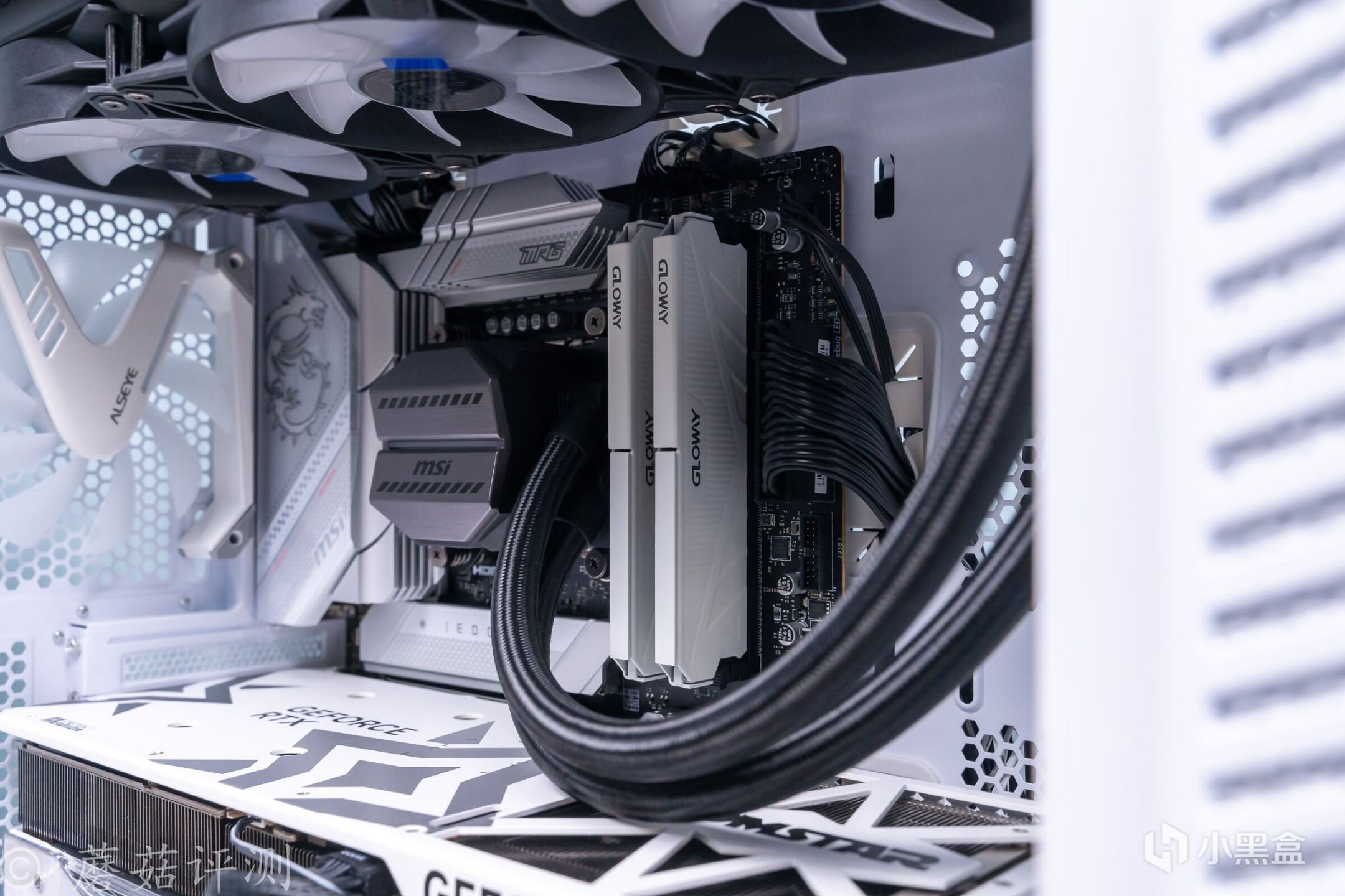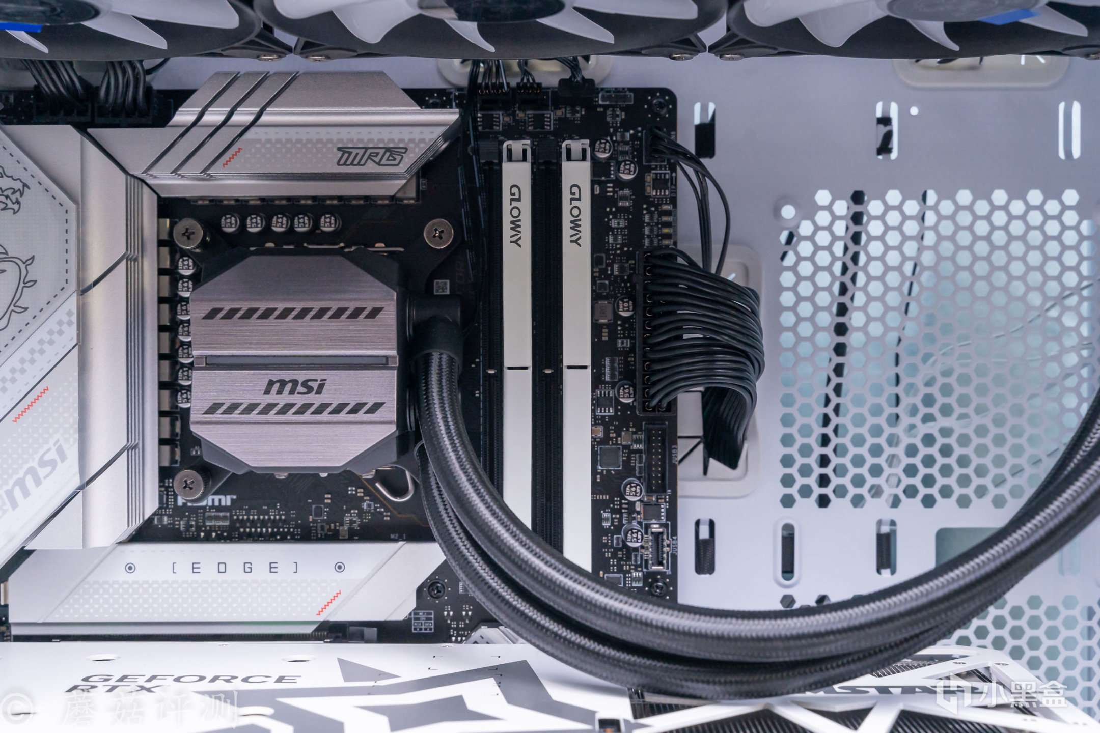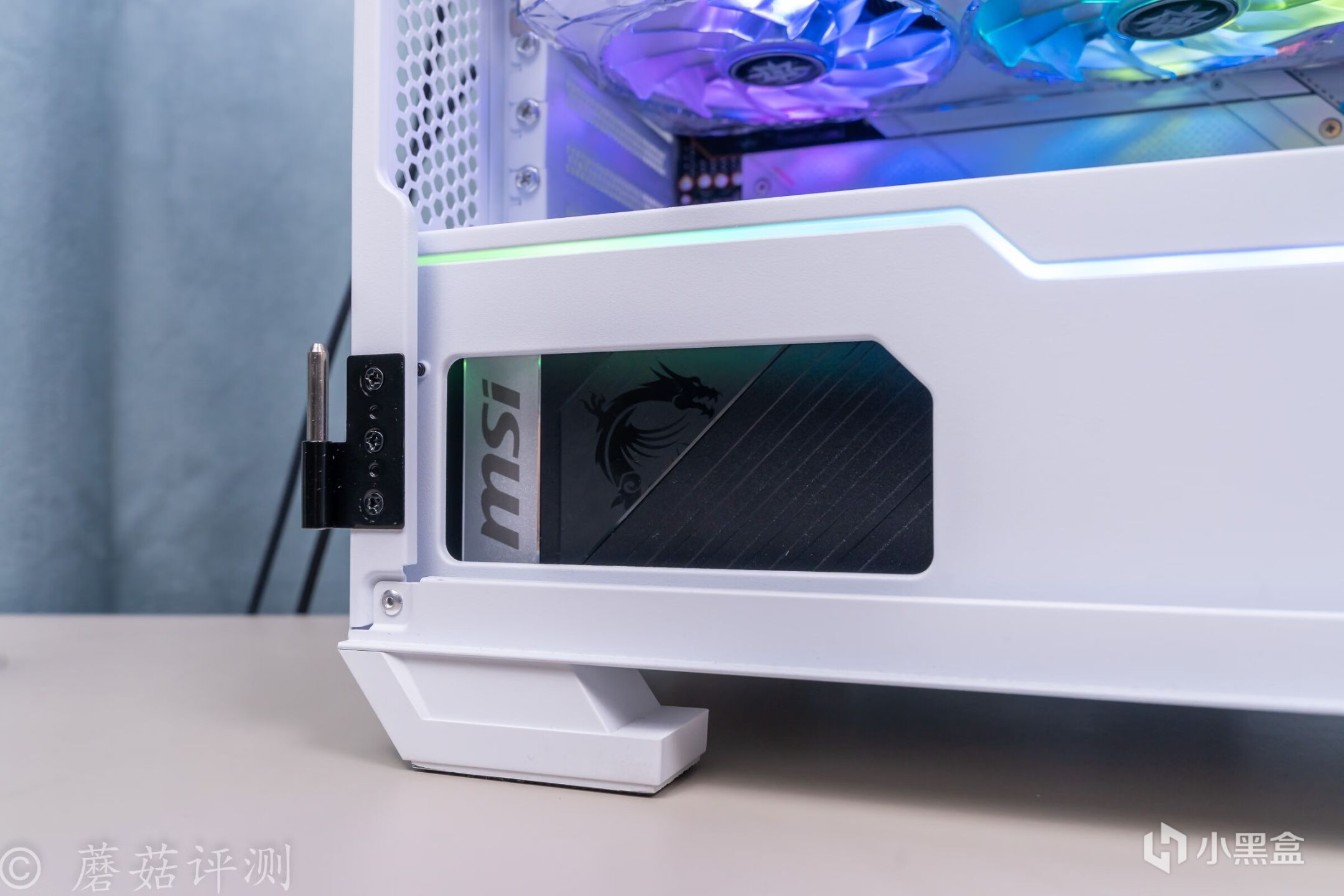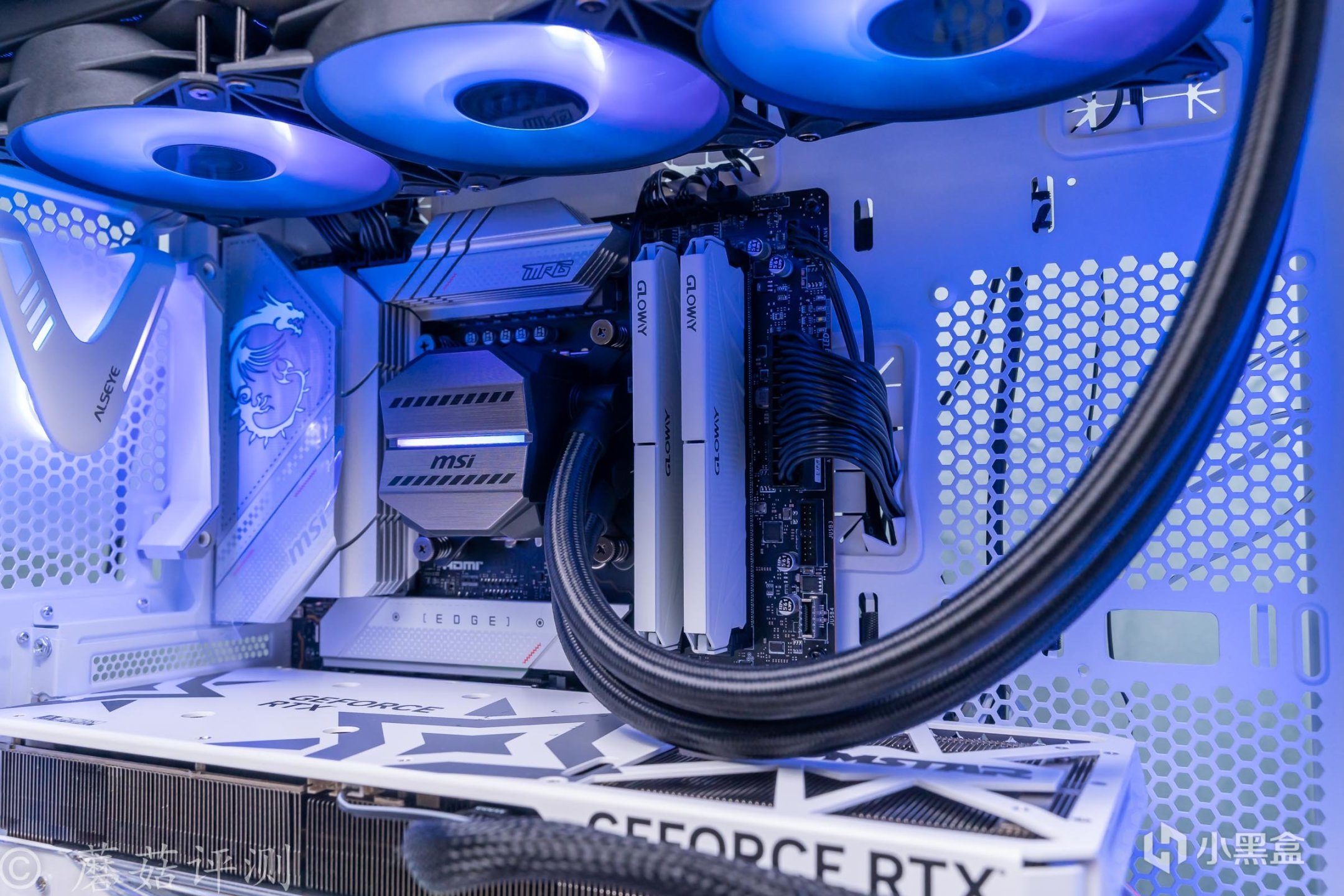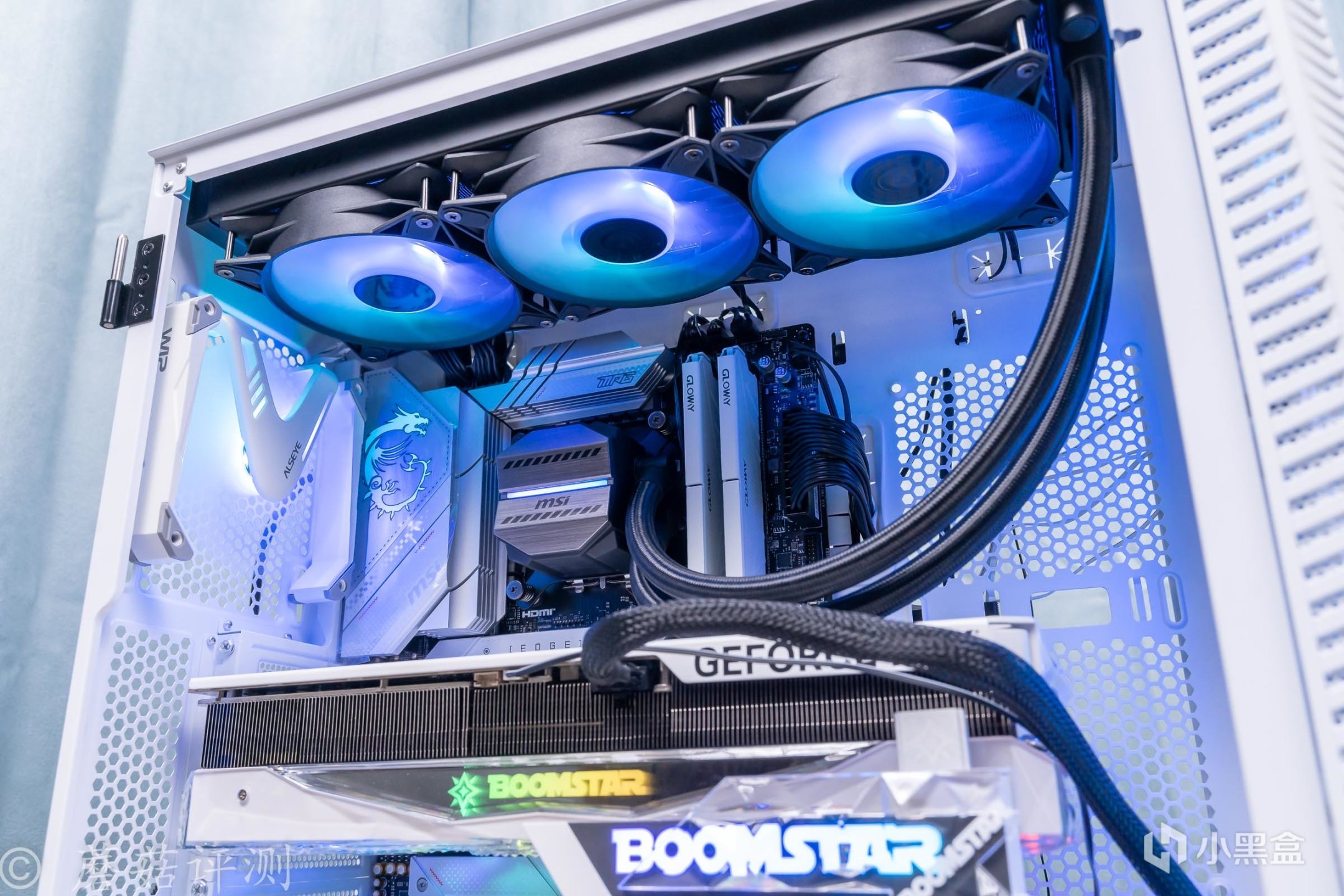 ▼機箱用的是微星的100R刀鋒機箱,白色版,這款機箱的顏值非常漂亮, 簡單的搭配一些白色的硬件,整體的效果就會非常的漂亮。另外,機箱前部擁有大面積的玻璃側透,內部標配了三把支持ARGB燈效的機箱風扇,整體的效果非常漂亮。