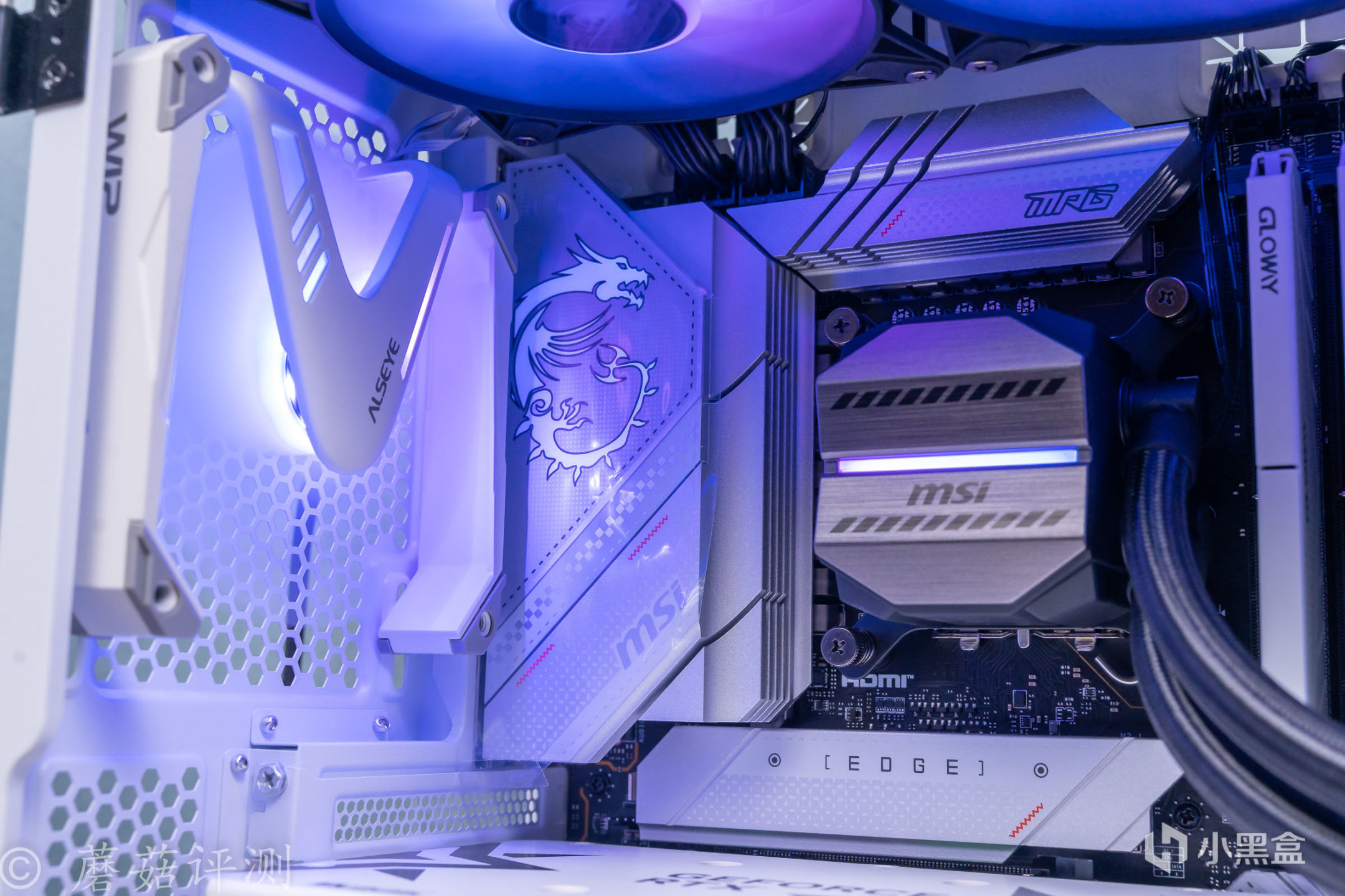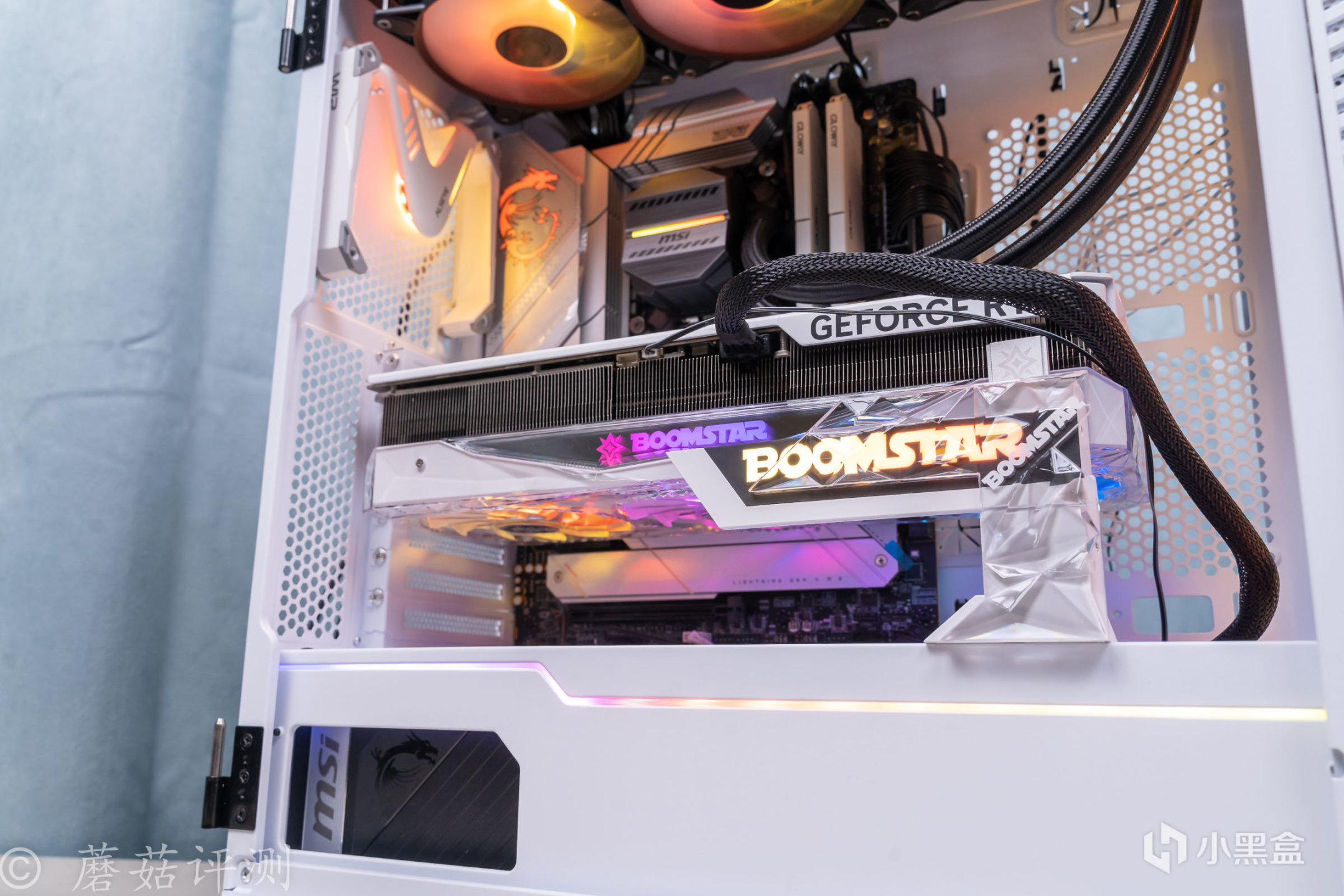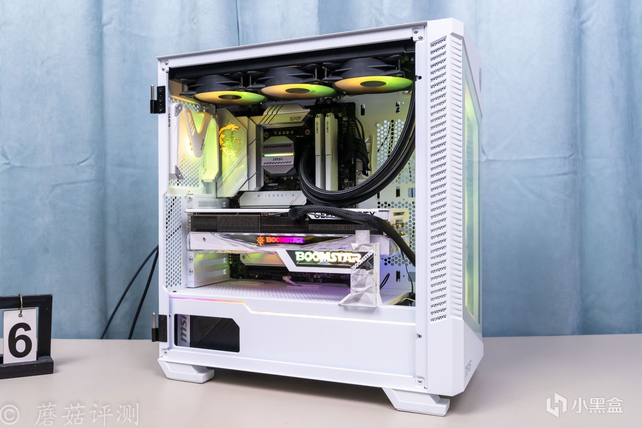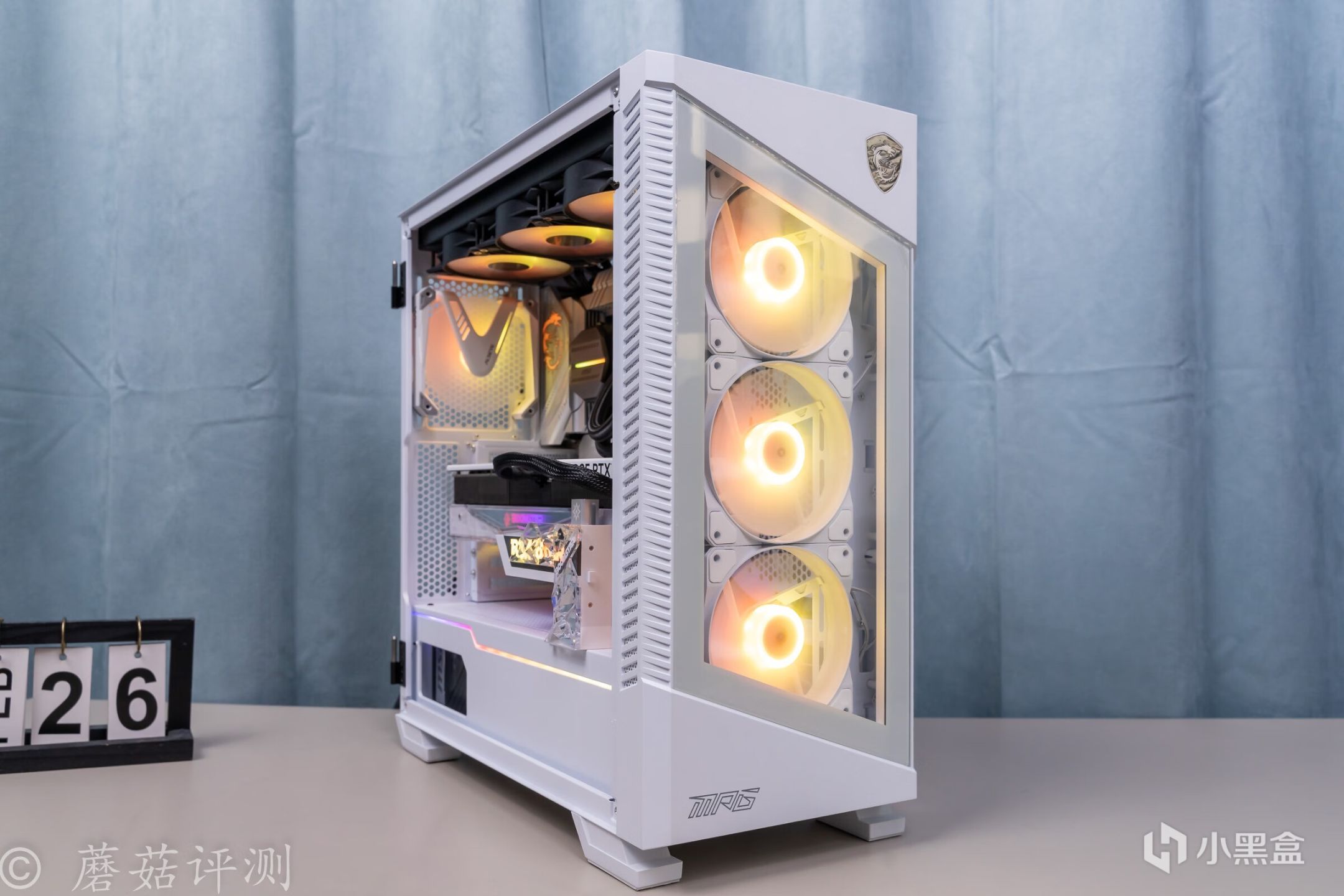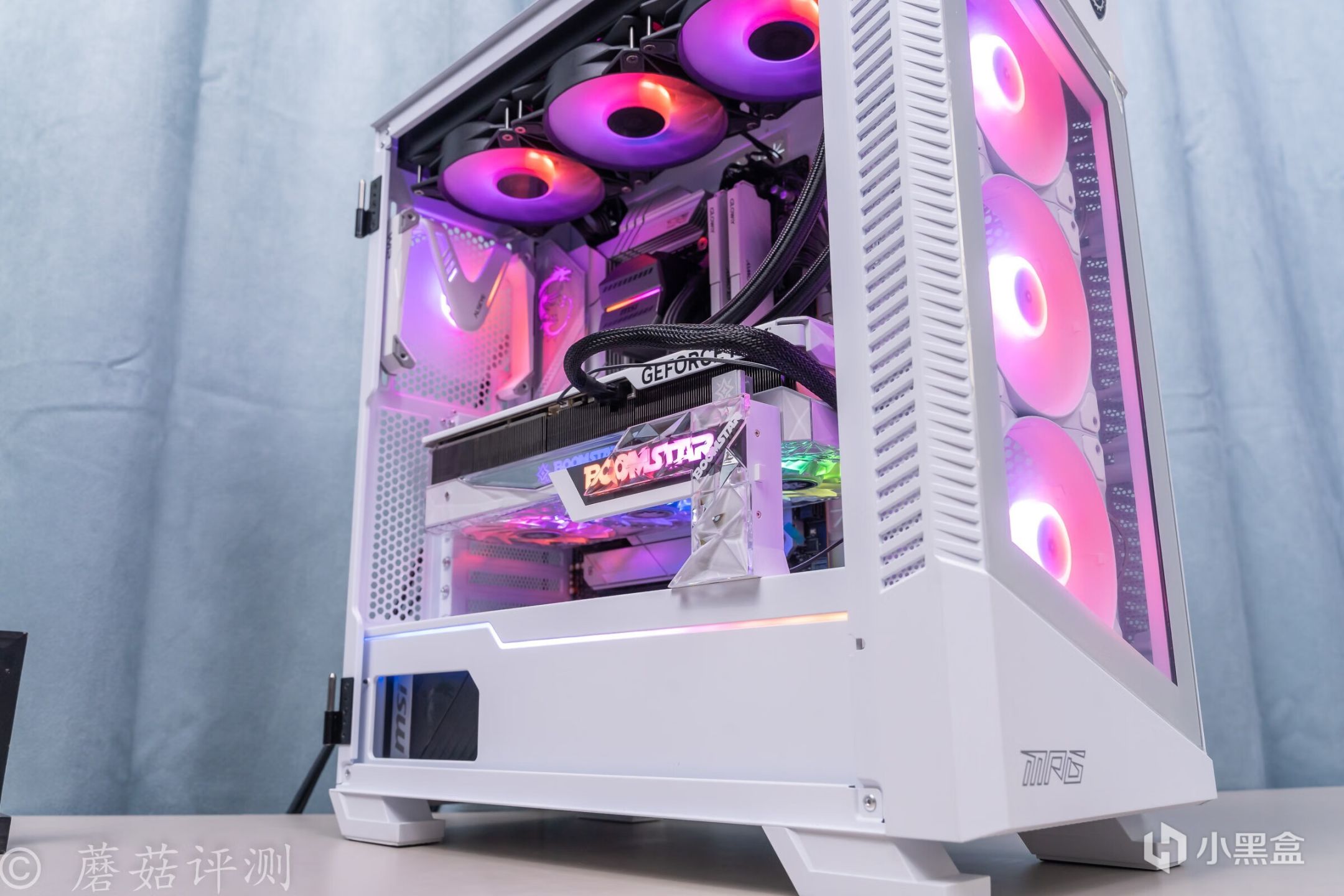 ▼機箱用的是微星的100R刀鋒機箱,白色版,這款機箱的顏值非常漂亮, 簡單的搭配一些白色的硬件,整體的效果就會非常的漂亮。另外,機箱前部擁有大面積的玻璃側透,內部標配了三把支持ARGB燈效的機箱風扇,整體的效果非常漂亮。