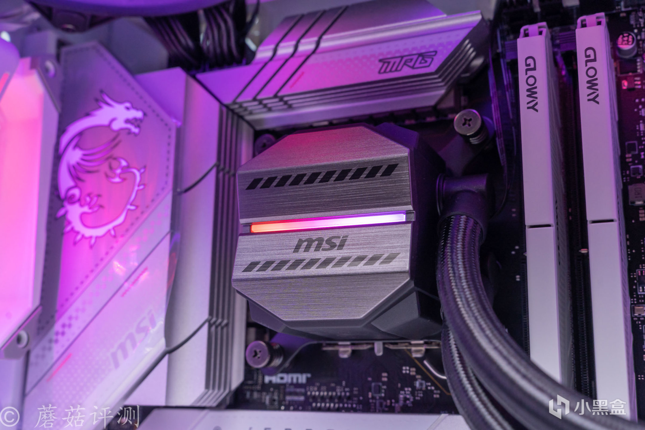 ▼用來壓制13700K處理器的,是微星的迫擊炮M360一體式水冷。水冷的水冷頭的外觀設計風格,和微星的炮擊跑系列主板一致,另外在中間部分還有一條ARGB燈帶。