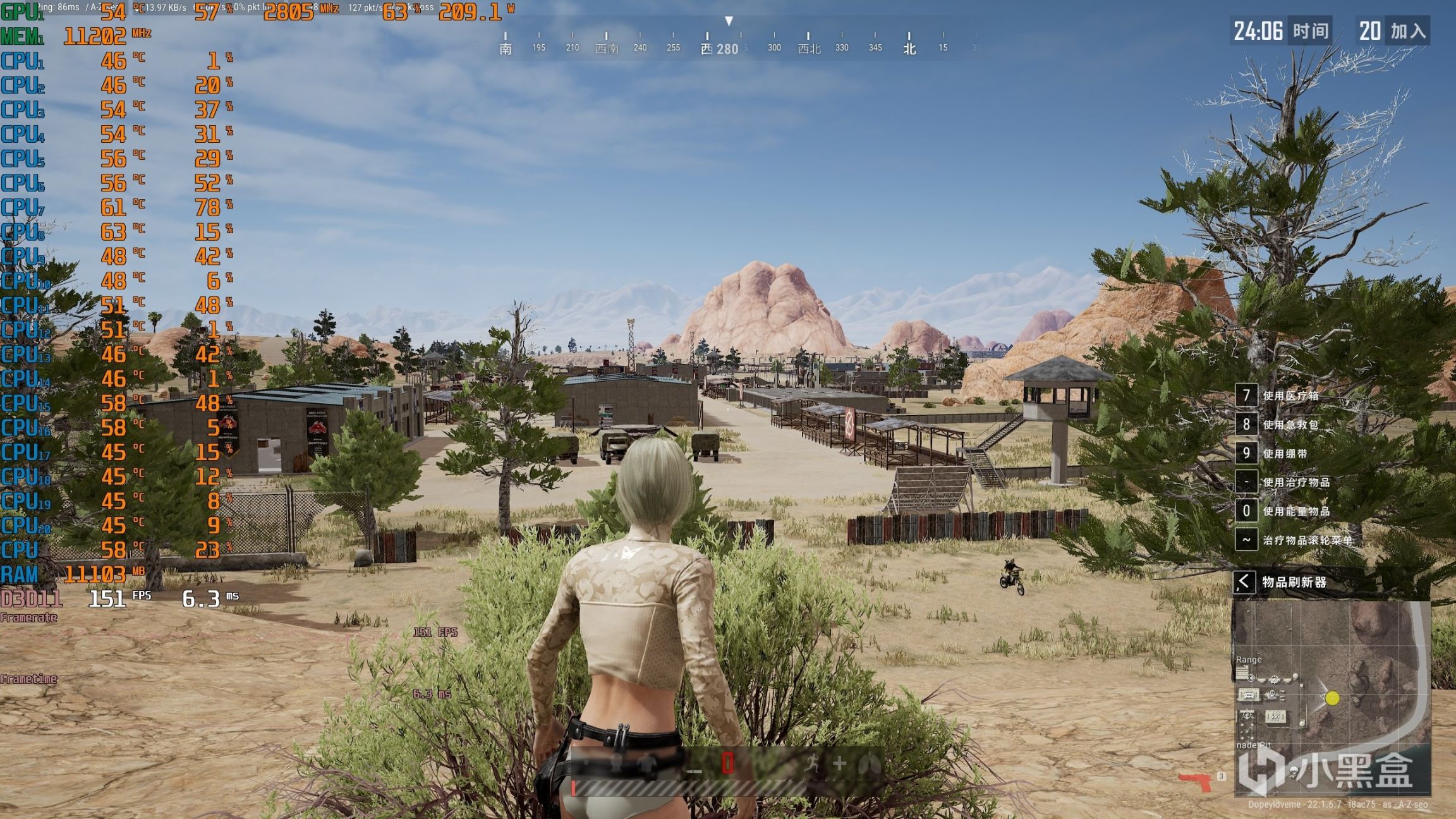 ▼再進入喫雞訓練場,相同位置的遊戲幀數提升到了151幀,幀延遲6.3ms。