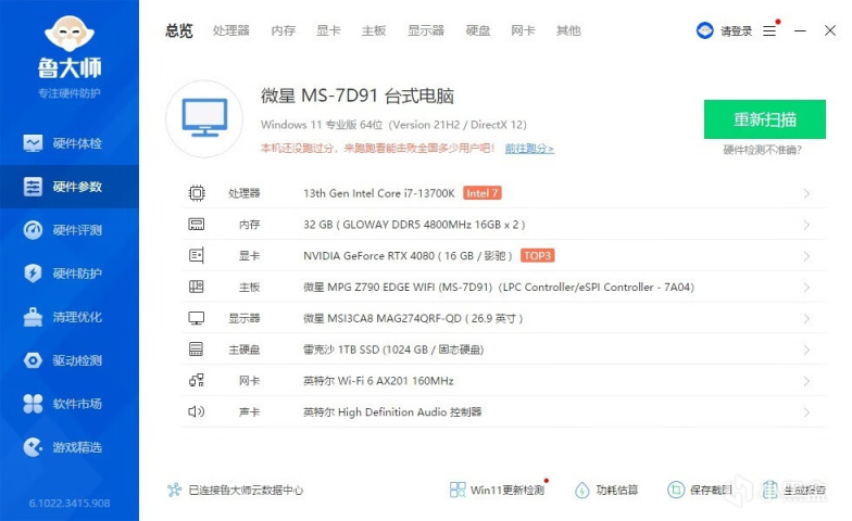 ▼簡單看下整機配置,處理器是13700K,主板是微星的刀鋒D5,顯卡是影馳的RTX4080星耀OC,整機配置很強。