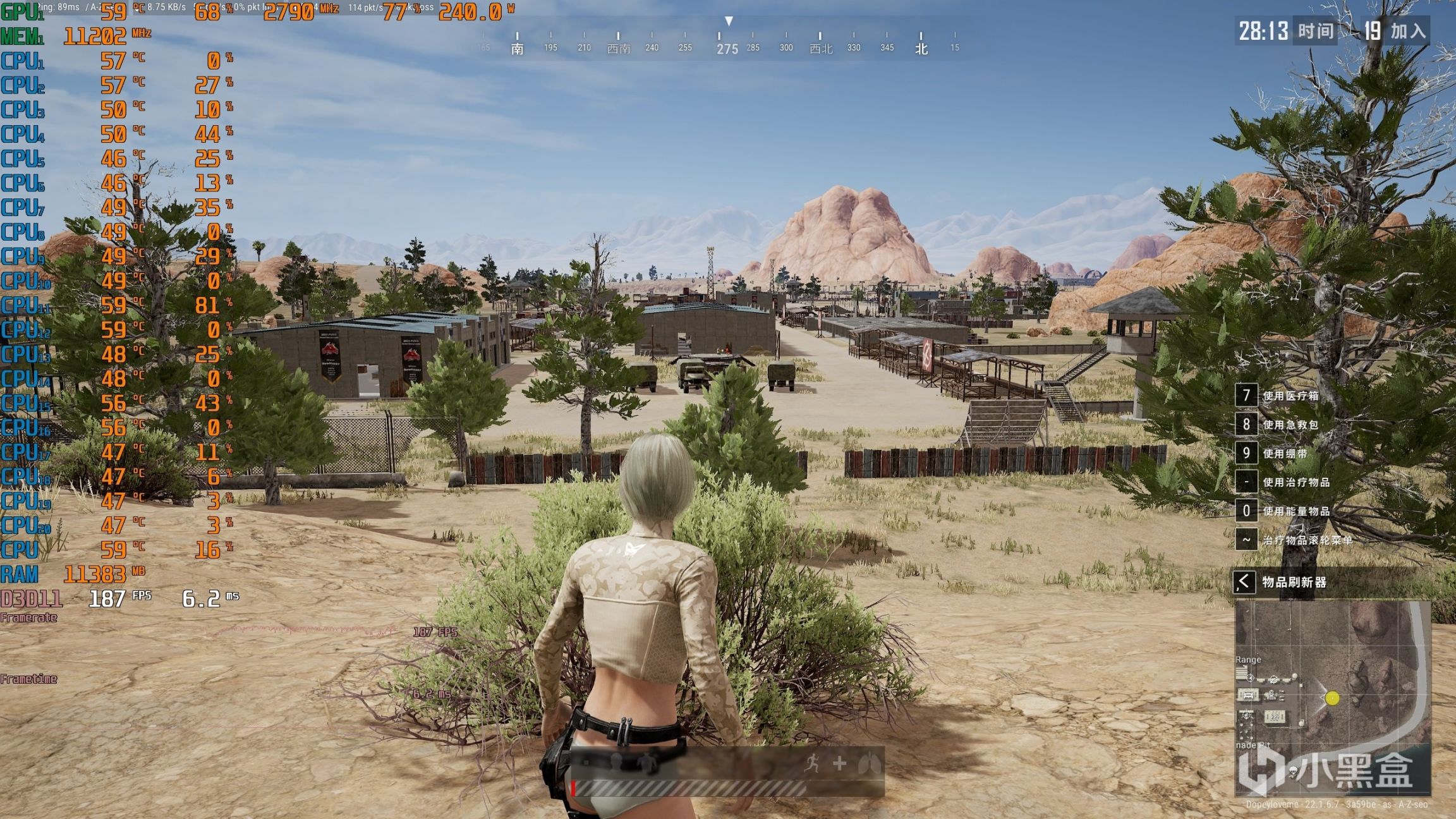 ▼再進入喫雞訓練場,遊戲幀數穩定在187幀左右,幀延遲6.2ms。