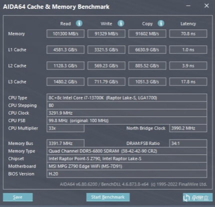 ▼跑個內存的讀寫測試,內存讀取101300MB/s、寫入91329MB/s、複製91602MB/s,延遲70.8ns。