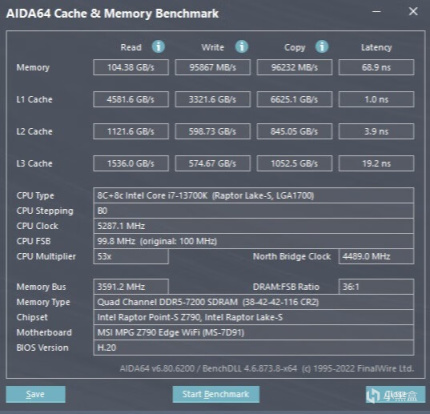 ▼跑個內存的讀取測試,內存讀取104.38GB/s、寫入95867MB/s、複製96232MB/s,延遲68.9ns。
