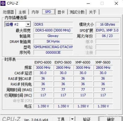 ▼再進入主板BIOS,打開XMP的配置文件2,內存頻率可以輕鬆穩定在6000MHz,時序30-36-36-77。