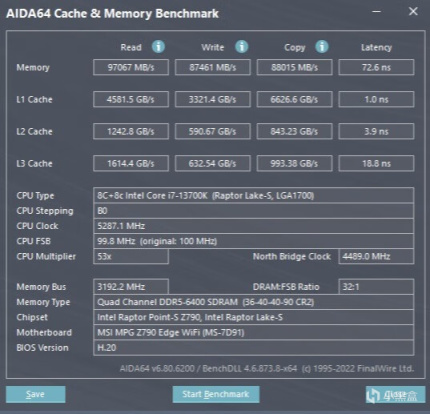 ▼內存的讀取速度97067MB/s、寫入87461MB/s、複製88015MB/s,延遲72.6ns。