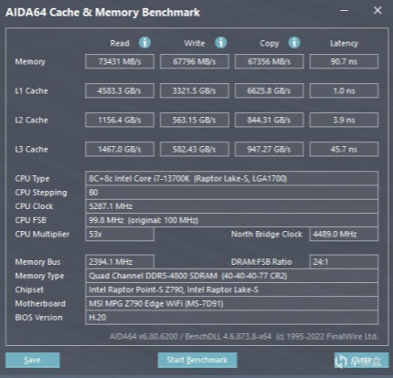 ▼簡單跑個內存的讀寫測試,內存讀取73431MB/s、寫入67796MB/s、複製67356MB/s,延遲90.7ns。