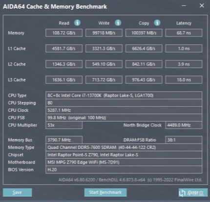 ▼內存讀取速度108.72GB/s、寫入99718MB/s、複製100397MB/s,延遲68.7ns。