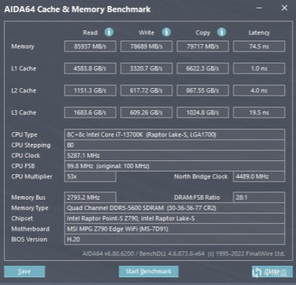 ▼簡單跑個內存的讀寫測試,內存讀取85937MB/s、寫入78689MB/s、複製79717MB/s,延遲74.5ns。