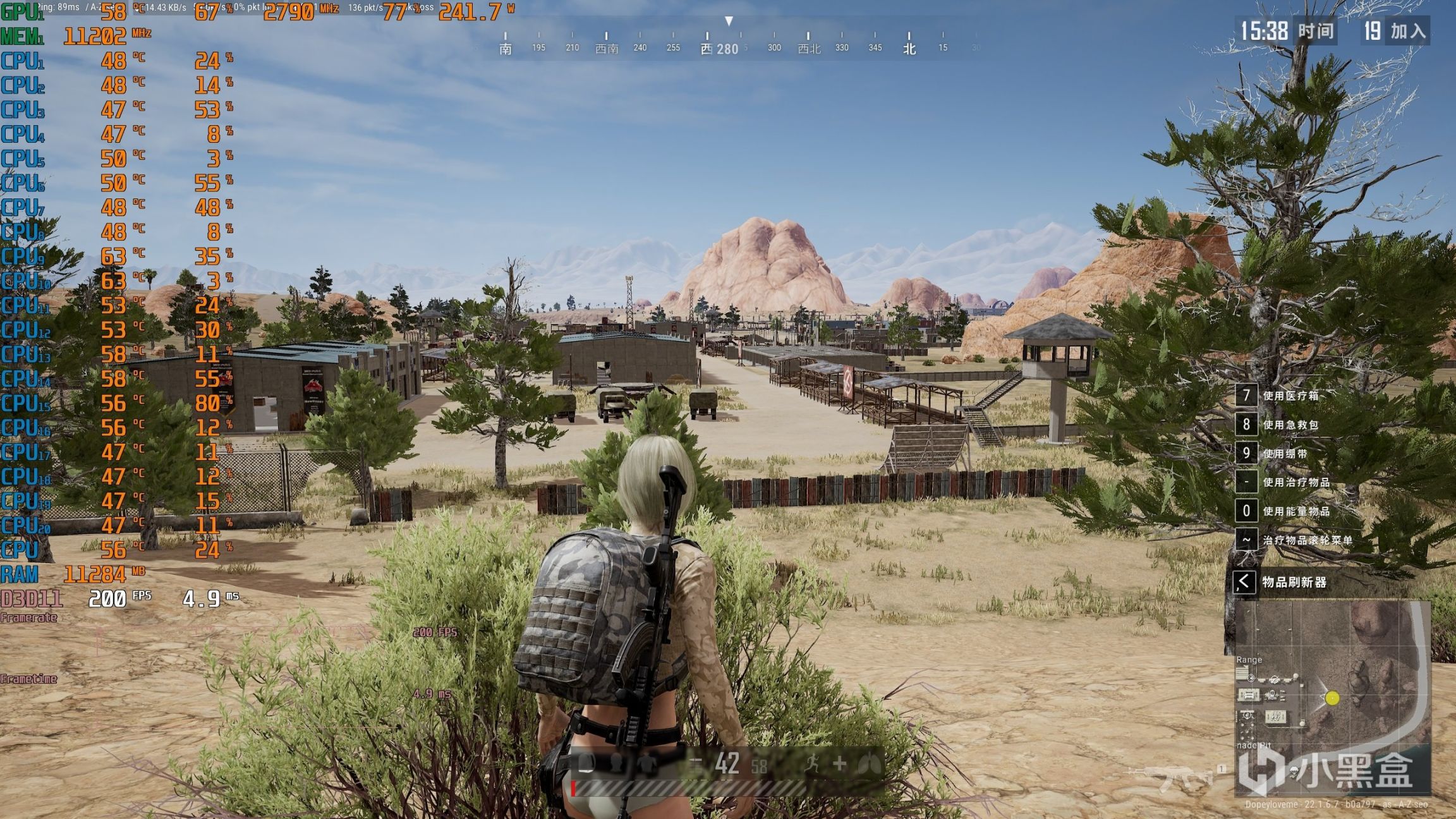▼在進入喫雞訓練場,遊戲幀數穩定在200幀,幀延遲4.9ms。