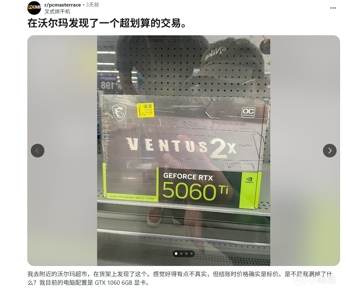 一名Reddit用户在沃尔玛购物时意外发现了一块仅售80美元的英伟达RTX 5060 Ti显卡。这一价格相较于该型号350美元至400美元的市场平均售价,折扣力度高达80%,在硬件社区引发了广泛关注和热议。