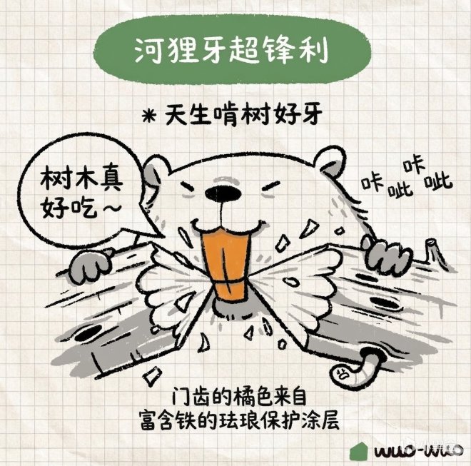 這顏色不是因爲髒,而是牙釉質富含鐵元素,硬度極高,能像鑿子一樣啃斷碗口粗的樹木