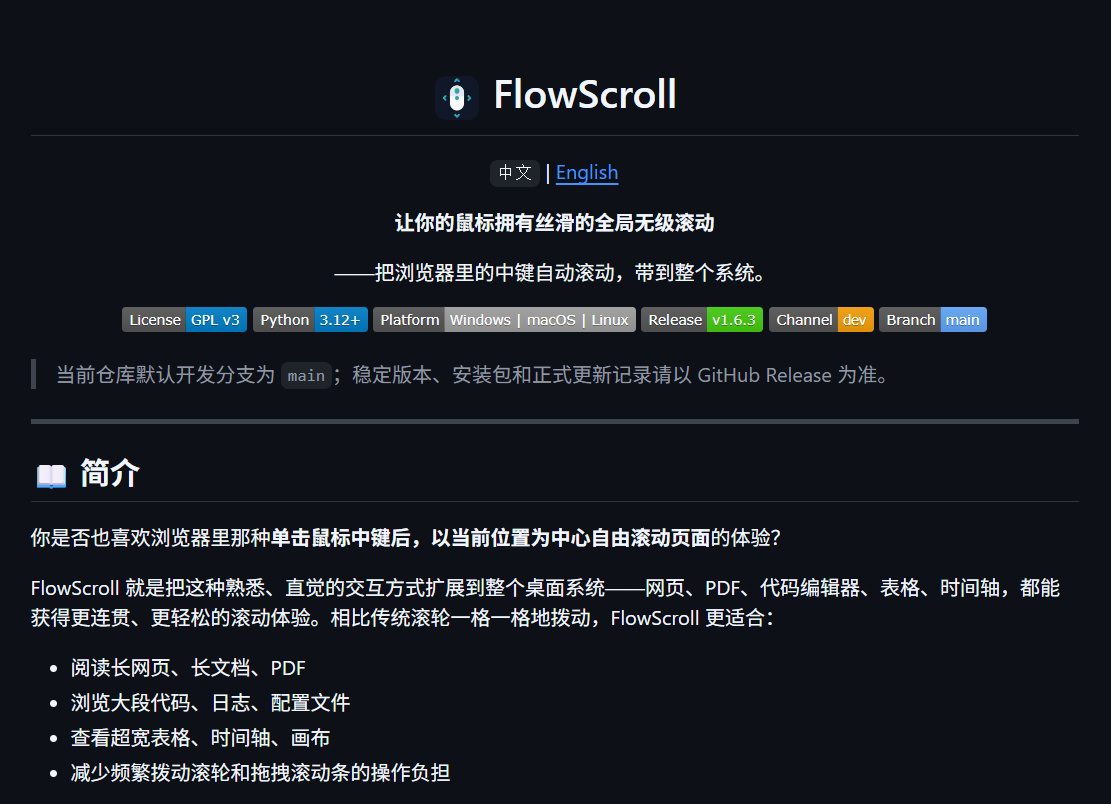 本周我在小黑盒和 GitHub 同步首发了 FlowScroll,这是一款跨平台全局平滑滚动工具,想必有些盒友还记得