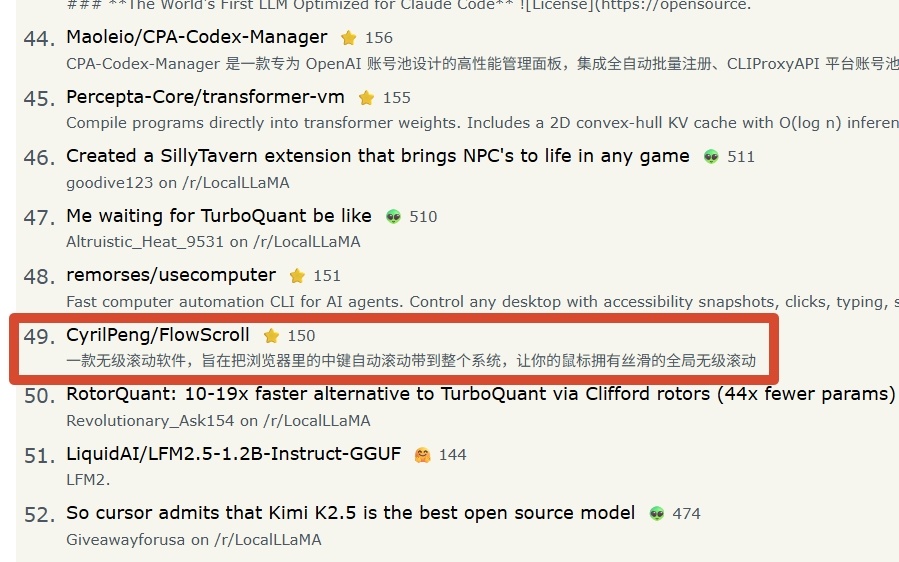 现在这榜单前排大多是 AI 相关的工具和 skills,然而 FlowScroll 是一个纯粹的桌面效率工具,既不套壳大模型也没蹭 AI 热度,能挤进 Top 50,多亏了盒友们前期的支持