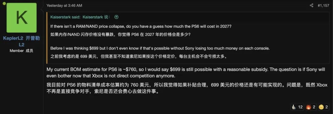 KeplerL2 在帖子中表示,目前對 PS6 無光驅基礎版的物料成本(BOM)預估約爲 760 美元,這個價格已經包含了 1TB 規格的 Gen5 固態硬盤,“只要索尼願意給出合理的首發補貼,699 美元的首發價依然是可實現的”。他同時補充,光驅版本的額外硬件成本並不高,真正會大幅推高售價的是更大容量的 SSD 配置 ,此前 PS5 Pro 的大幅漲價,核心誘因之一就是標配的 2TB 固態硬盤。