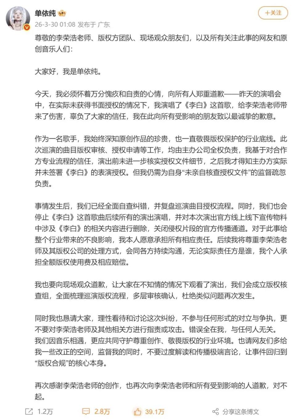 3月30日凌晨,歌手單依純就深圳演唱會未經授權演唱李榮浩作品《李白》一事,發佈長文公開致歉。她承認因未親自核查授權文件、輕信主辦方流程,導致在未獲書面授權的情況下登臺演唱,對李榮浩、版權方及現場觀衆造成了傷害,並表示將停止《李白》後續所有演出演唱,個人承擔全額版權使用費及賠償,同時成立版權覈查組完善巡演流程。