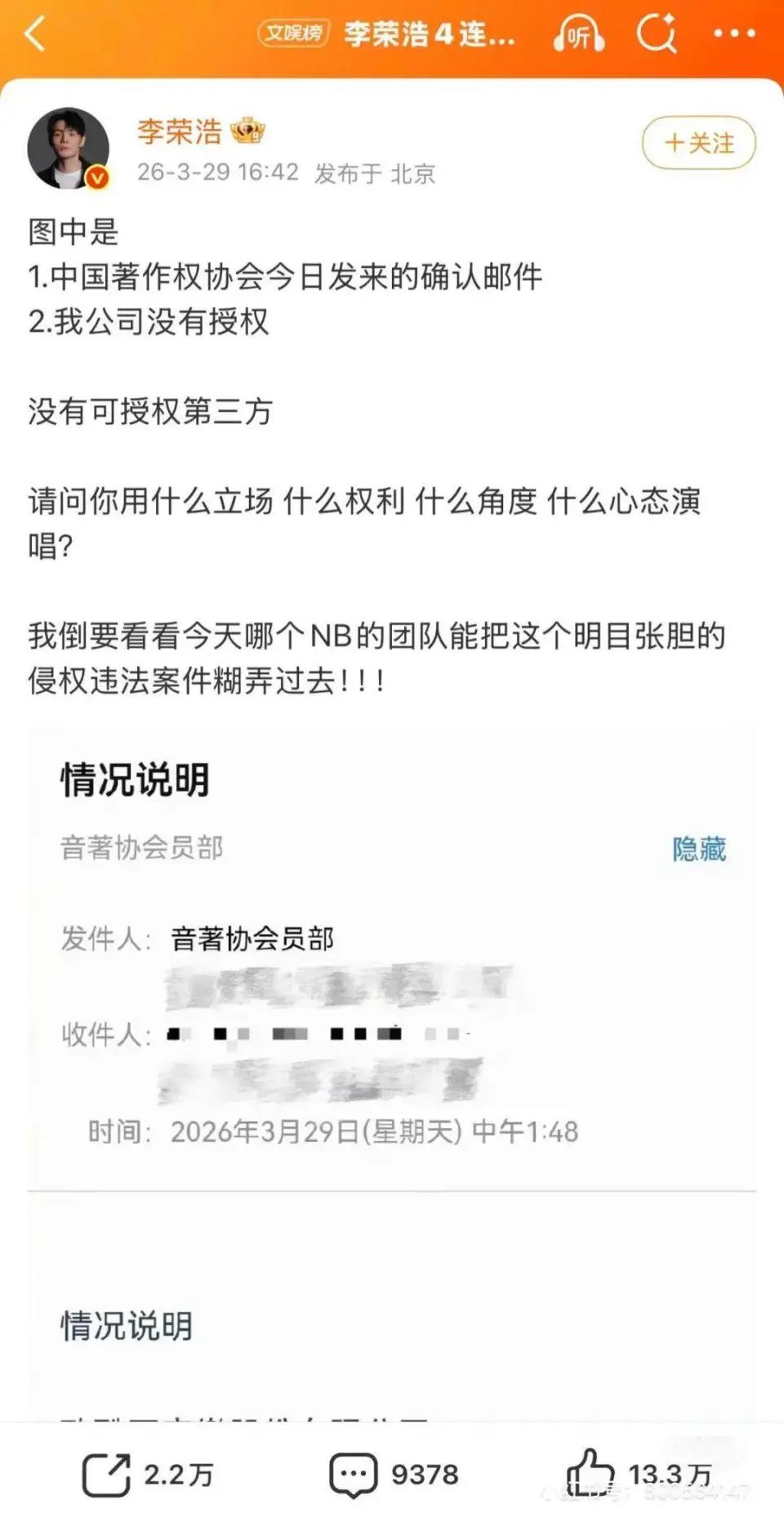 此前,李榮浩已接連發布多條微博,附上中國著作權協會及版權公司的確認郵件,證實單依純方曾申請《李白》演唱授權但被明確拒絕,3月28日深圳場演出仍屬於強行侵權行爲。他還表示,自己從始至終都尊重單依純作爲歌手的努力,但版權底線不容觸碰。