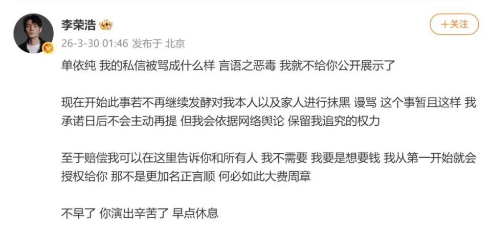 隨後,李榮浩發文回應,明確表示“不需要賠償”,同時強調此次事件本質是無授權情況下的強行侵權,希望事件迴歸版權合規本身,也呼籲網友理性討論,不要對相關方進行攻擊。