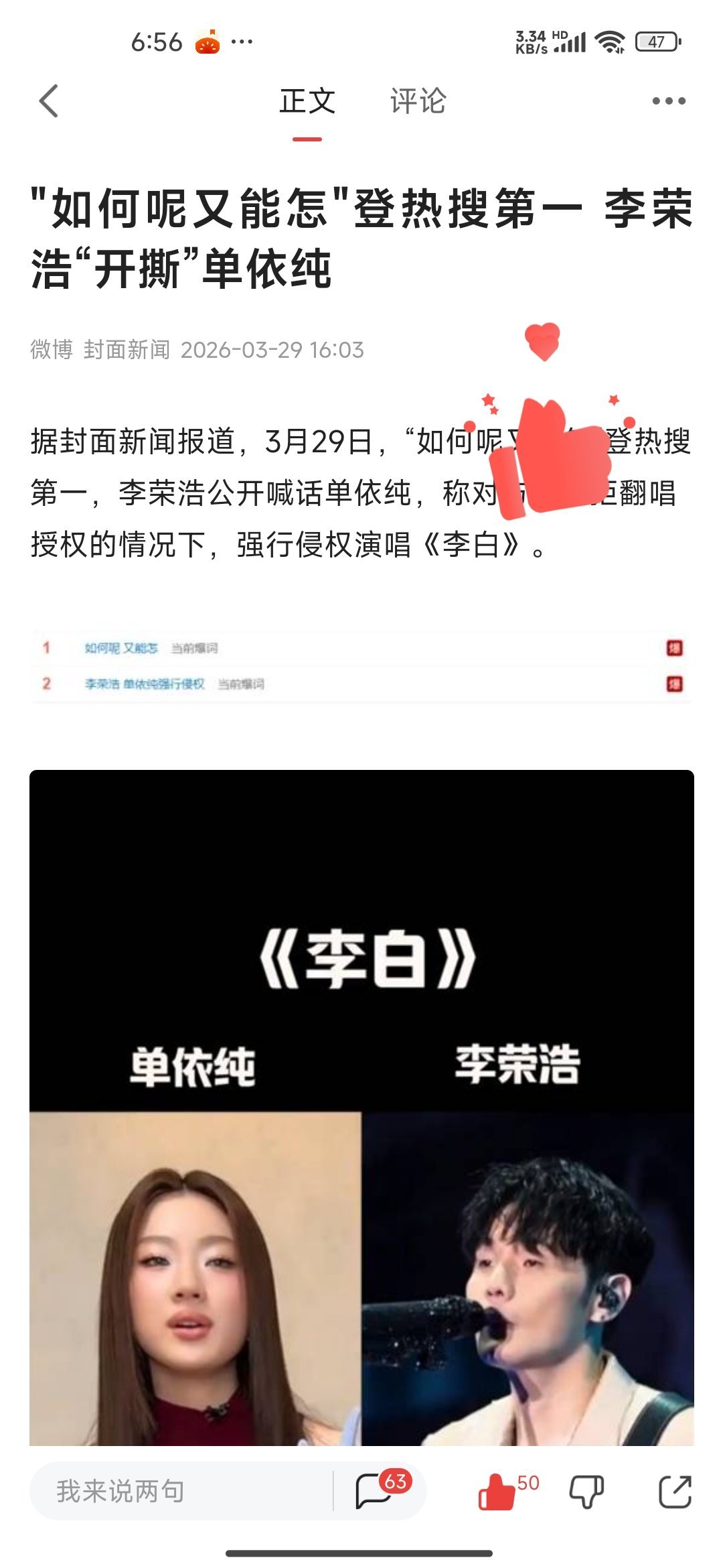 娛樂圈的熱搜向來不缺話題,但一場原創音樂人與新生代歌手的正面交鋒,還是以壓倒性熱度登頂榜首,引發全網熱議。3月29日,向來以溫和、高情商著稱的李榮浩,突然在社交平臺公開發文,直指新生代唱將單依純,措辭嚴厲、證據確鑿,這場被網友稱爲“開撕”的風波,徹底打破了兩人此前看似平和的交集,而單依純曾出圈的那句“如何呢又能怎”,更是成爲這場爭議中最諷刺的註腳。