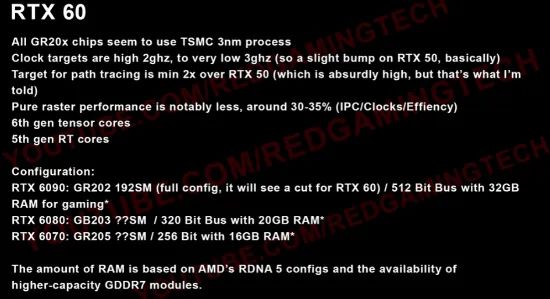据爆料,该系列将采用台积电3nm工艺打造,核心性能侧重光线追踪与路径追踪,传统光栅性能预计较RTX 50系列提升30%-35%,而路径追踪性能目标是实现约2倍的飞跃。旗舰型号RTX 6090预计搭载GR202核心,配备192个SM单元、32GB显存与512-bit位宽;中端的RTX 6080、6070也将迎来显存与位宽的显著升级,分别配备20GB/320-bit、16GB/256-bit规格。此外,新卡还将搭载第六代Tensor Core与第五代RT Core,进一步强化AI、DLSS与光追表现。